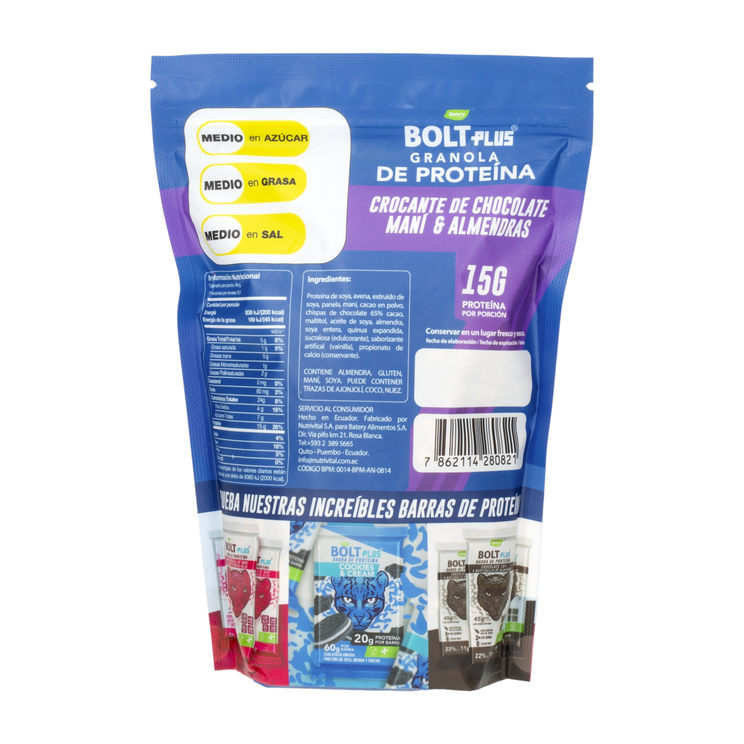- Con una combinación deliciosa de trozos de chocolate, maní y almendras, esta granola no solo satisface tu paladar, sino que también es una excelente fuente de proteínas que ayuda a la reparación muscular y al crecimiento de los tejidos