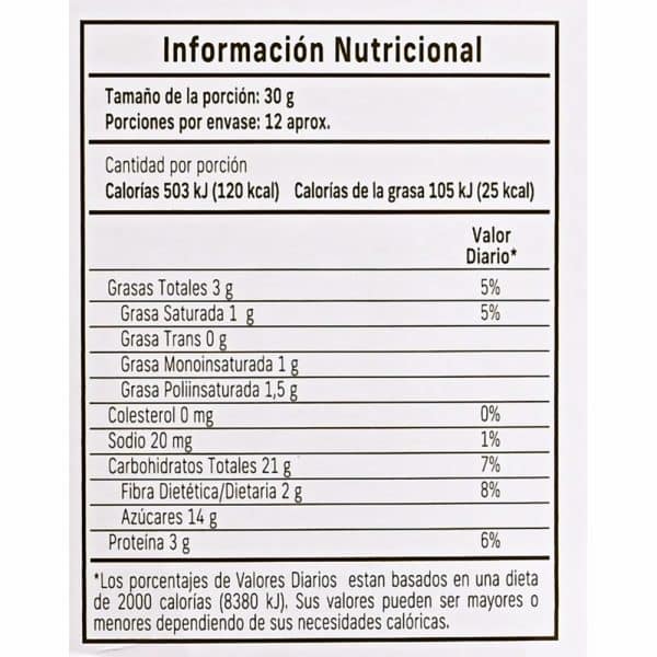 Delicioso acompañante, para todas tus recetas. Contiene avena, trigo, arándano, pasa, uvilla, manzana, piña. Ideal para tu desayuno y rico en fibra soluble