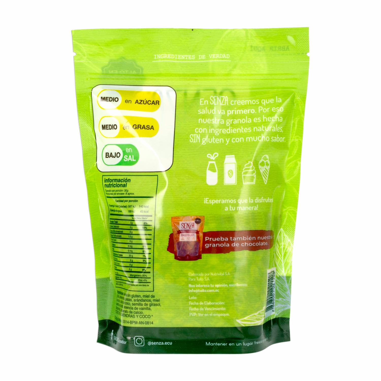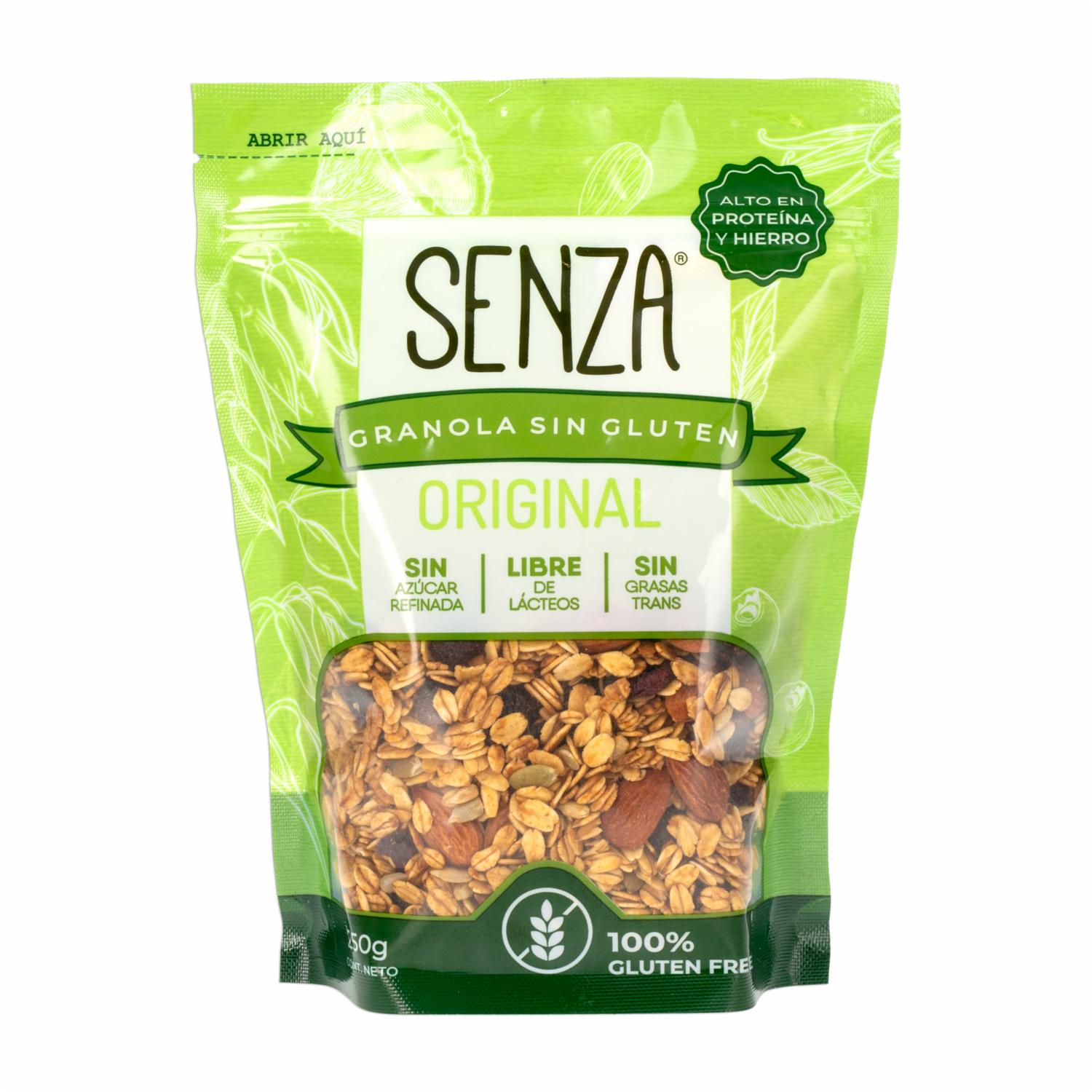 - Granola sin azúcar refinada, libre de lácteos y sin grasas trans. En SENZA creemos que la salud va primero. Por eso nuestra granola es hecha con ingredientes naturales, SIN gluten y con mucho sabor. Producto alto en proteína y Hierro