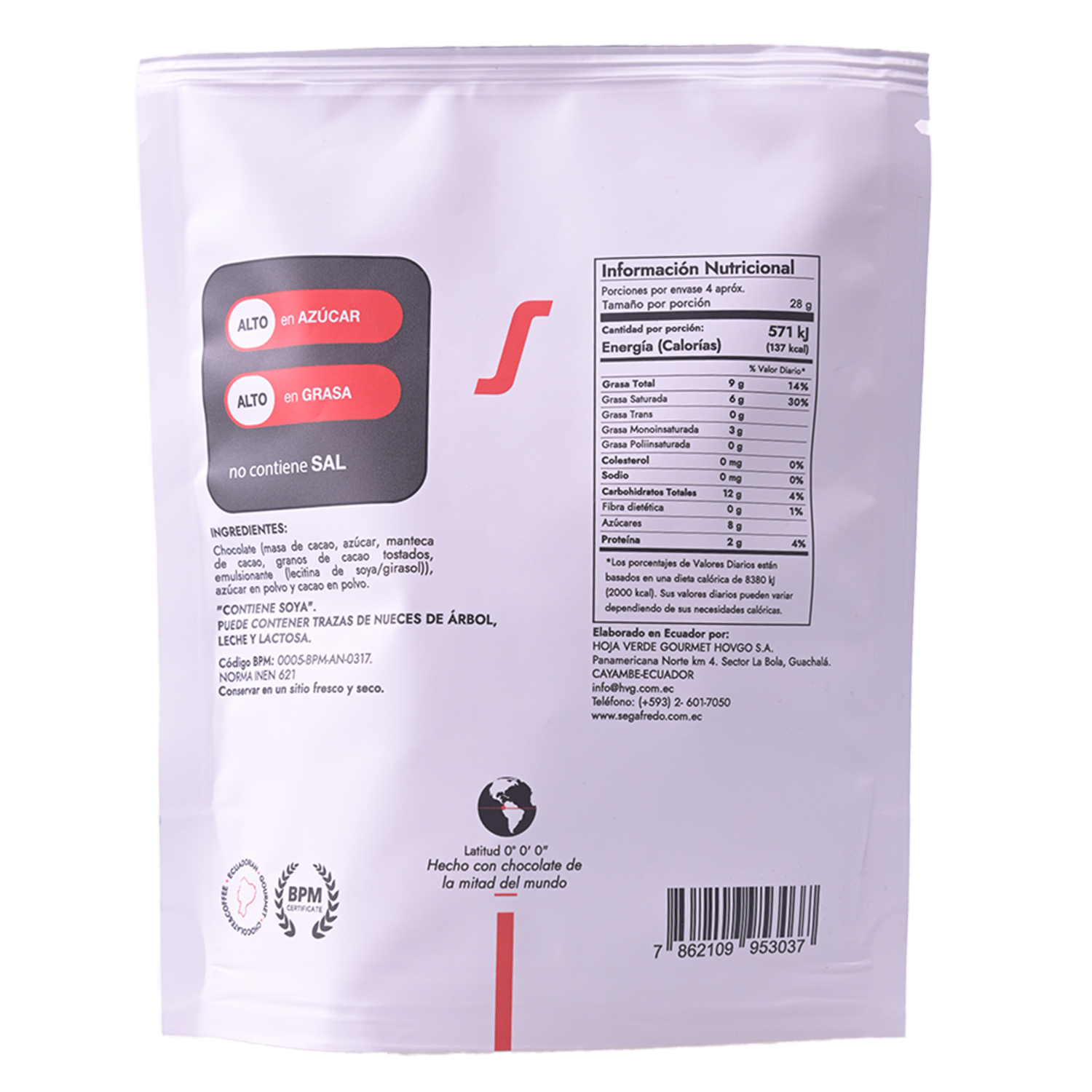 - Granos de cacao recubiertos con chocolate ecuatoriano fino de aroma y una delicada capa de polvo de cacao. Esta combinación nos permite resaltar los sabores característicos del chocolate y sentir la textura que nos brinda la mezcla de la deliciosa fusión del cacao y el chocolate oscuro