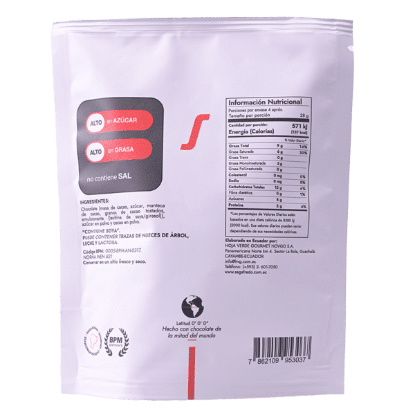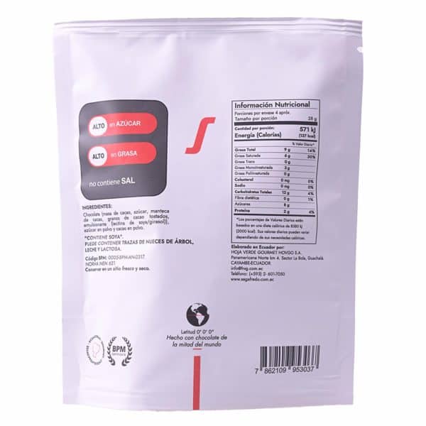 Granos de cacao recubiertos con chocolate ecuatoriano fino de aroma y una delicada capa de polvo de cacao. Esta combinación nos permite resaltar los sabores característicos del chocolate y sentir la textura que nos brinda la mezcla de la deliciosa fusión del cacao y el chocolate oscuro
