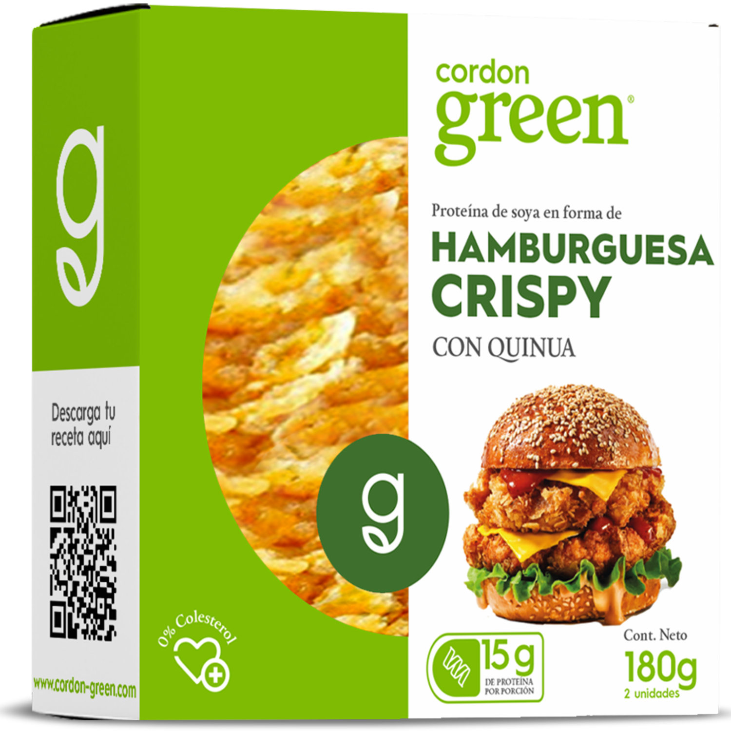 La Hamburguesa De Soya Y Quinua Crispy Cordon Green En Presentación De 180 G Es Una Opción Deliciosa Y Nutritiva Para Aquellos Que Buscan Una Alternativa Vegana Y Saludable A Las Hamburguesas Tradicionales, Esta Hamburguesa Está Elaborada A Base De Proteína De Soya Y Quinua,,que Son Fuentes De Proteínas Vegetales De Alta Calidad, La Presentación De 180 G Te Permite Disfrutar De Una Hamburguesa Individual, Perfecta Para Una Comida Ligera O Para Acompañar Tus Platillos Favoritos