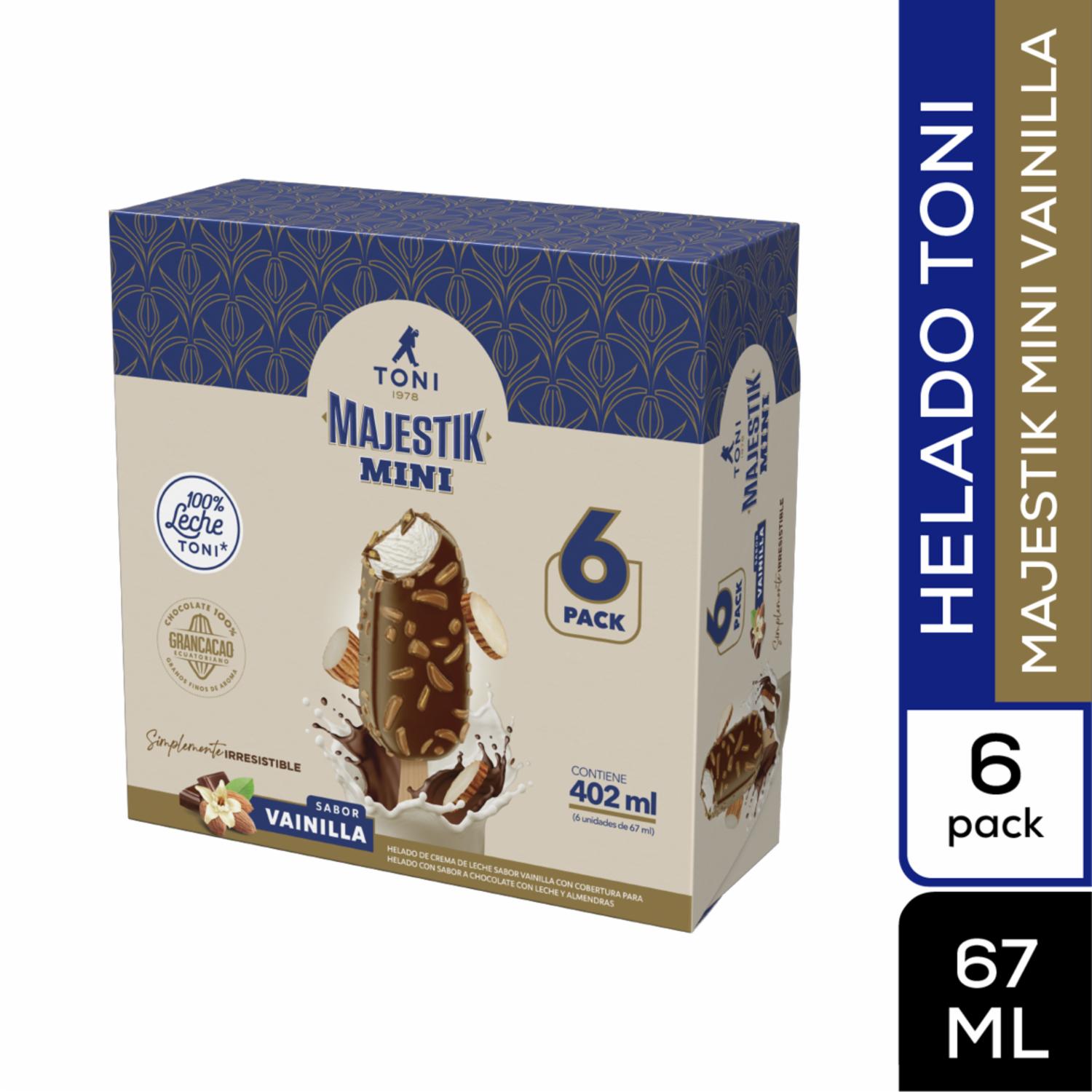 Helado Majestik Mini Vainilla Cubierto De Chocolate Y Almendras TONI 6 X 67 Ml – TONI. Disponible en nuestros locales. Precio y stock pueden variar según la tienda.