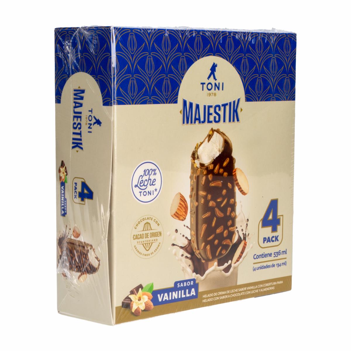 - Helado Toni Majestik sabor vainilla exótica. Hecho con 100% leche Toni cubierto de chocolate con cacao fino de aroma ecuatoriano y almendras