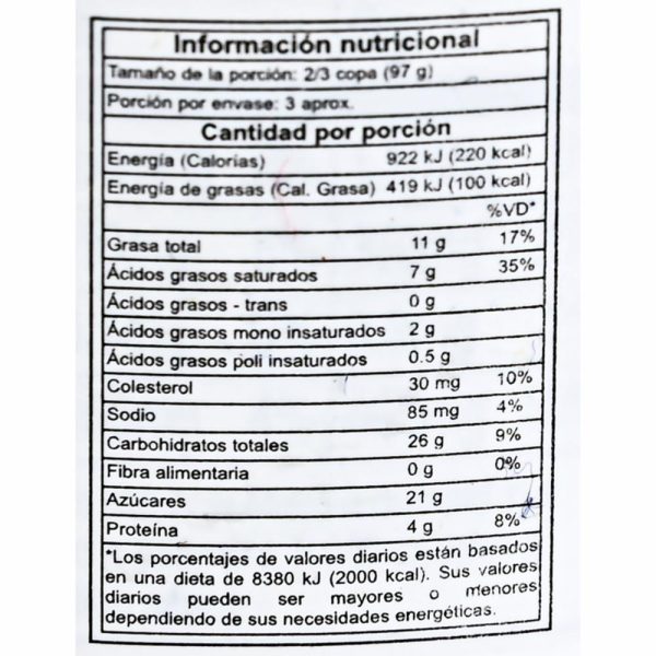 - Sabor a frambuesa y chardonnay - Presentación en envase de 473 ml - Textura suave y cremosa - Elaborado con ingredientes naturales de alta calidad - Sin conservantes ni colorantes artificiales - Producto apto para veganos y vegetarianos (dependiendo de la receta utilizada)