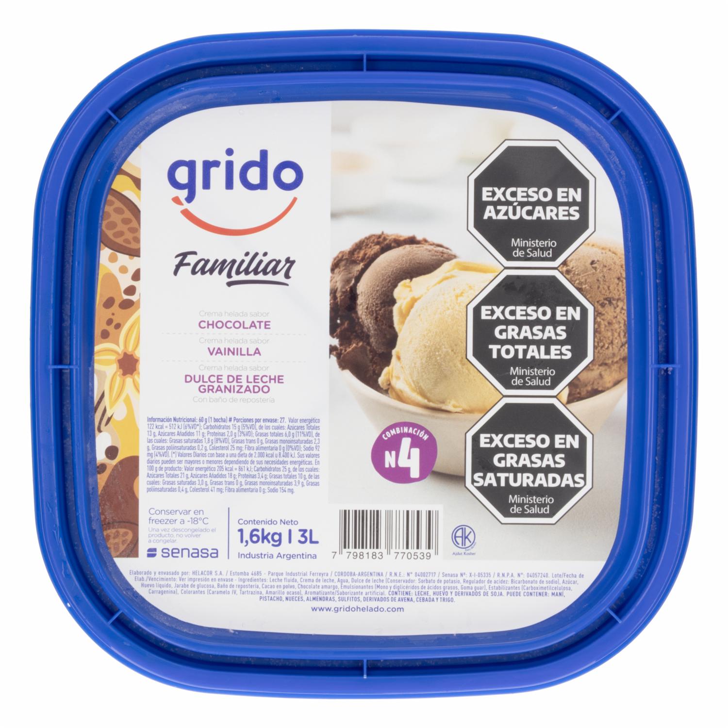 Helado Sabor Chocolate, Vainilla Y Dulce De Leche Granizado GRIDO 1600 G