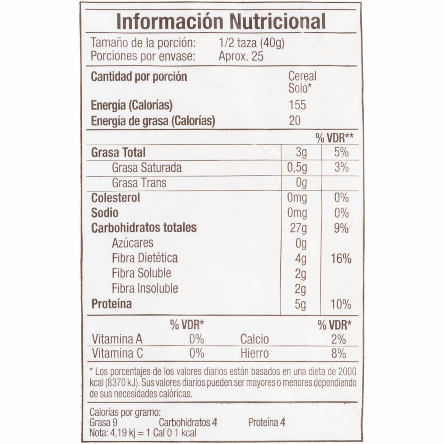 Cereal de origen natural, como parte de una dieta variada y equilibrada; aporta a un estilo de vida saludable, actúa en nuestro organismo para mantener los niveles de colesterol