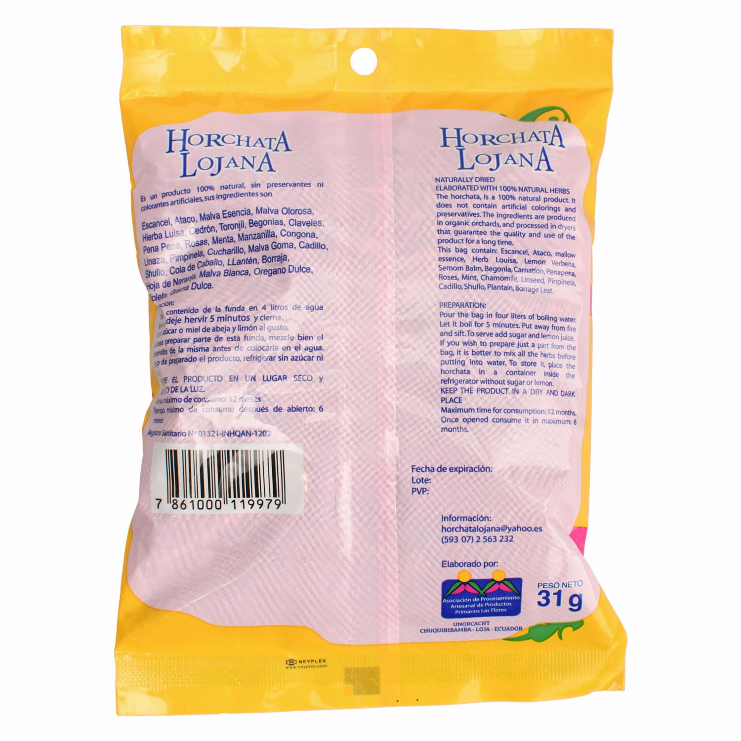 Experimenta la rica tradición de la horchata con un toque especial de la región de Loja con la Horchata Para Infusión LOJANA. Esta mezcla cuidadosamente elaborada te permite disfrutar de los sabores únicos de la horchata en una infusión reconfortante y deliciosa