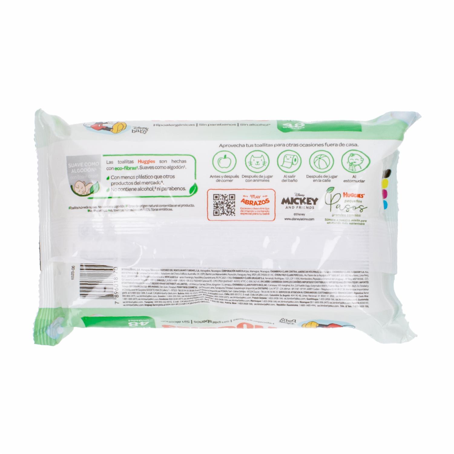 Toallitas Húmedas Huggies® Limpieza Efectiva. Cuidado natural con Eco-Fibras. Fibras de origen natural contenidas en el producto para una suavidad como el algodón?. Toallitas húmedas con control de olor y triple hoja de absorción?. Hipoalergénicas, Sin parabenos y Sin Alcohol?