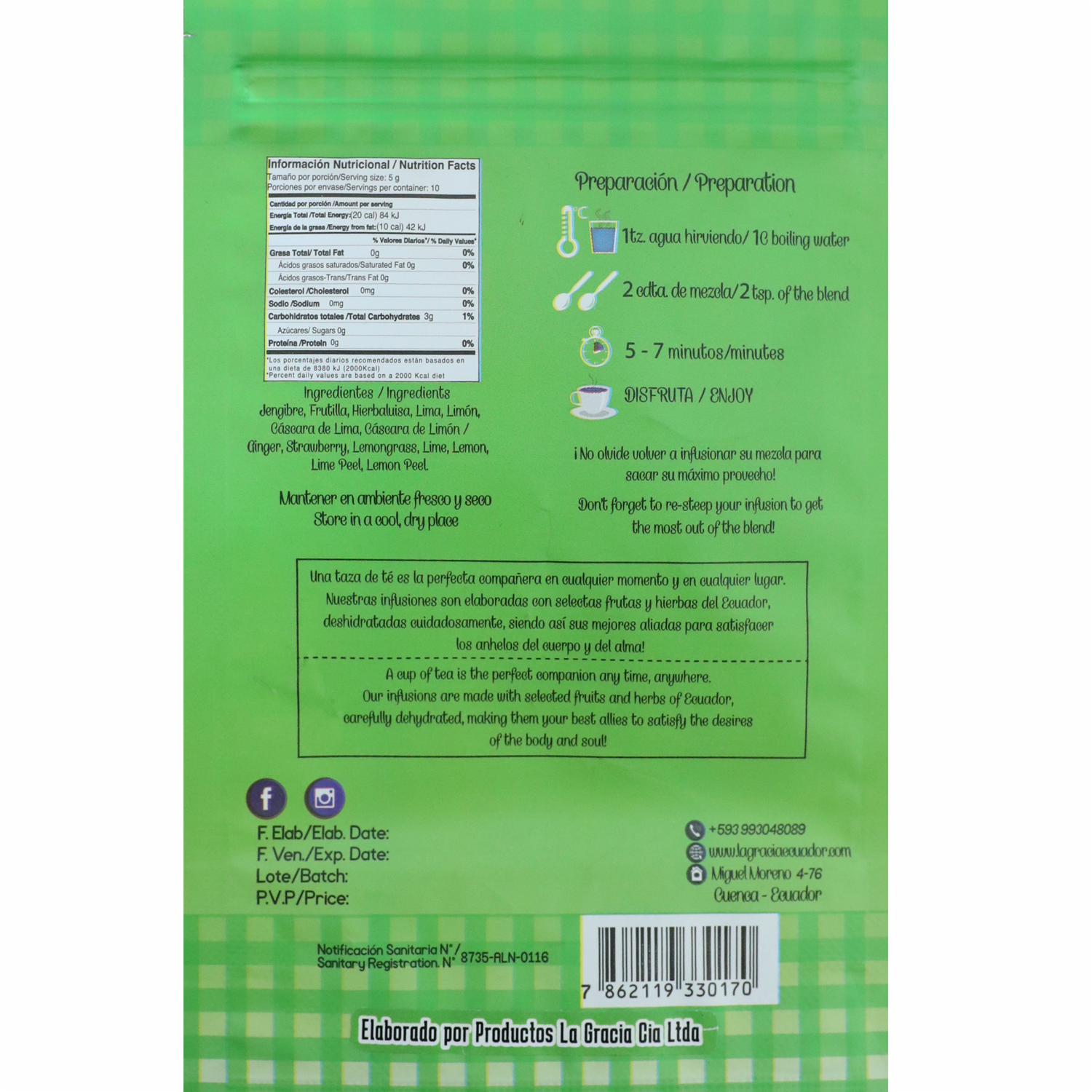 - Mezcla de frutas deshidratadas para infusión aromática caliente: jengibre, frutilla, hierbaluisa, lima, limón, cáscara lima, cáscara limón
