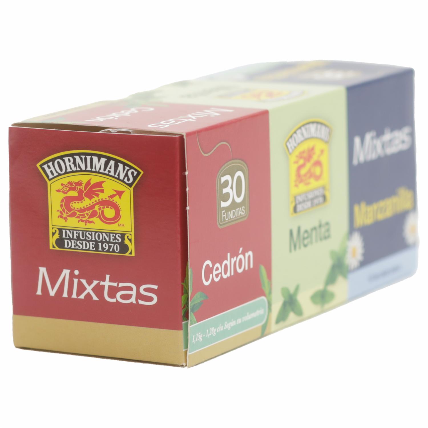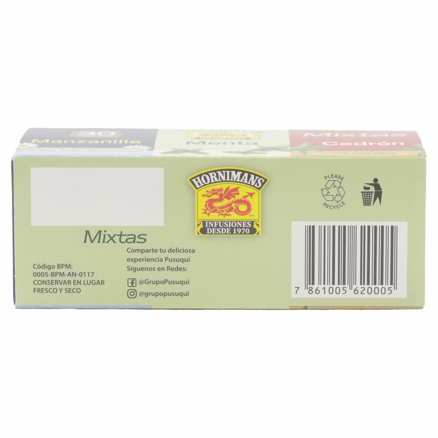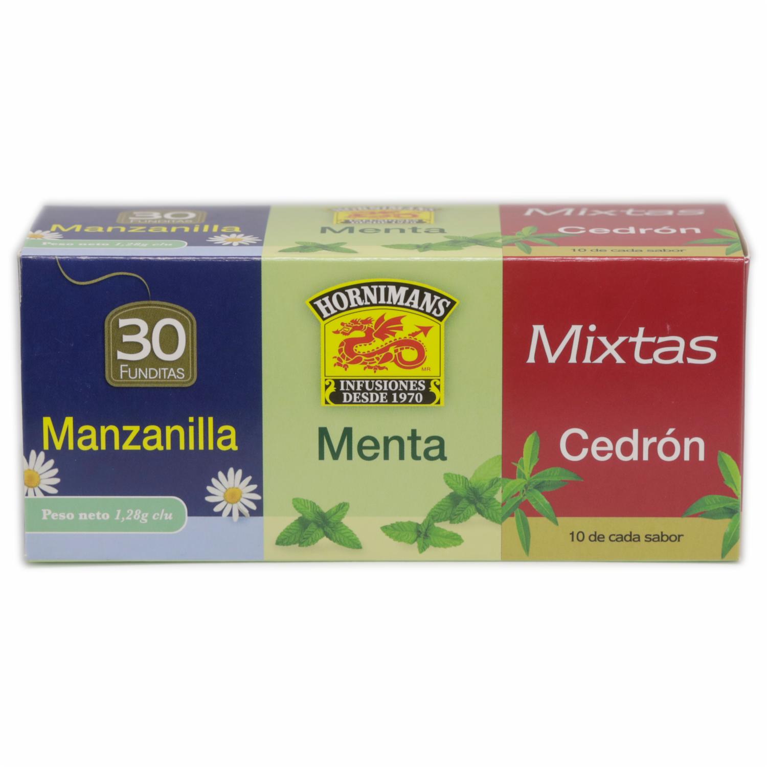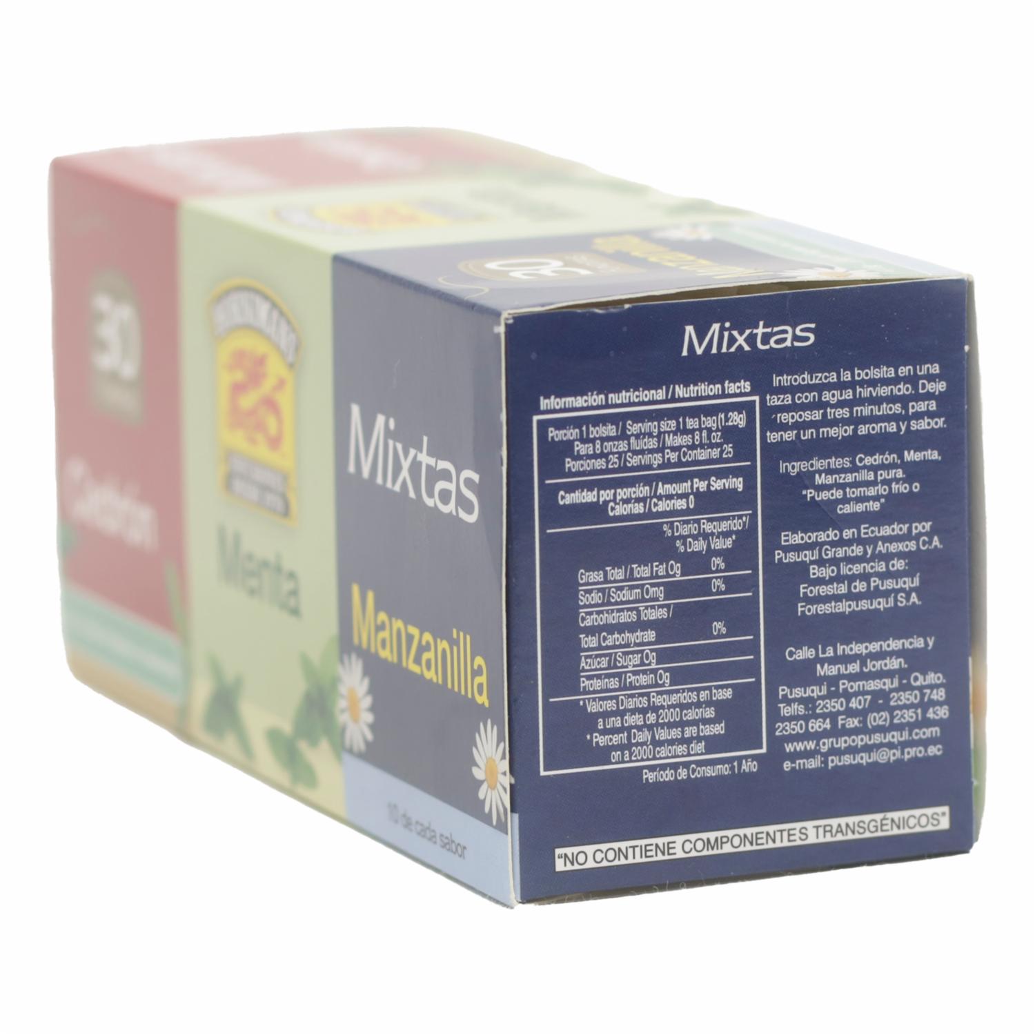 - Infusión mixtas es una caja que contiene 10 sobres de Manzanilla, 10 sobres de menta y 10 sobres de cedrón, cada infusión contiene propiedades que te ayudan para la digestión