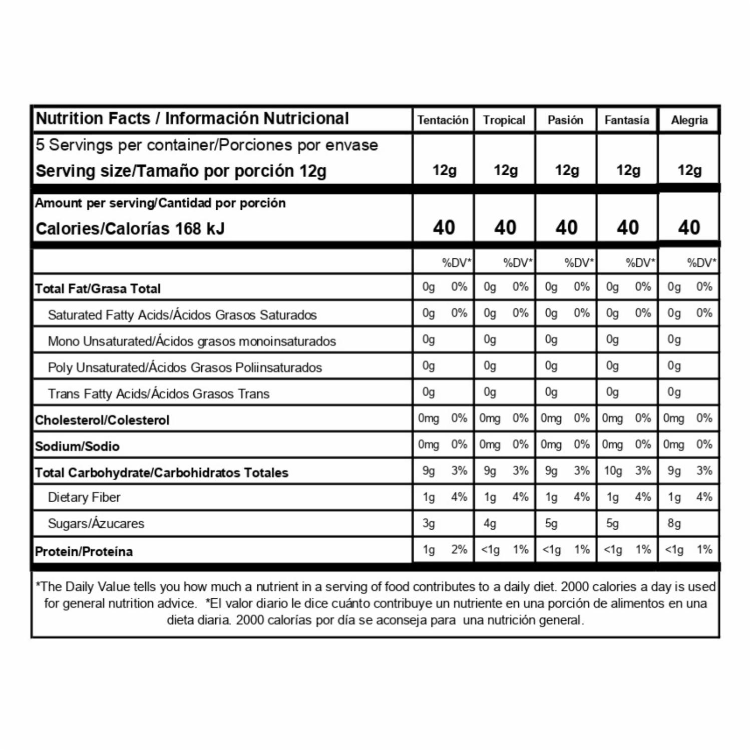 • Puedes consumirlas frías o calientes. Ingredientes: tentación, alegría, pasión, fantasía y tropical. Contenido Neto: 5 unidades. Peso Neto: 60g