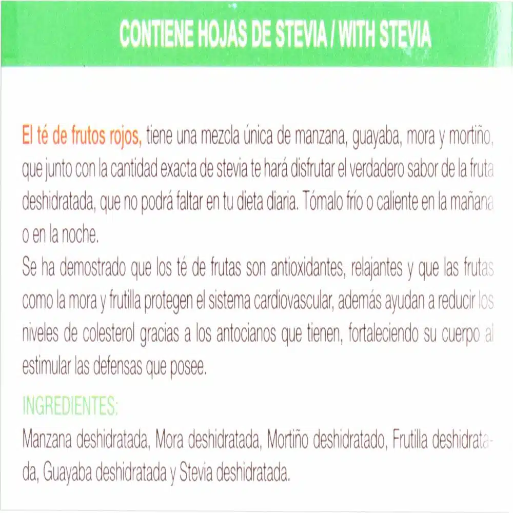 El Té De Frutos Rojos Tiene Una mezcla Única De25 Manzana, Guayaba, Mora , Mortiño Y Frutilla , Que Junto Con La Cantidad Exacta De Stevia Te Hará Disfrutar El Verdadero Sabor De La Fruta Deshidratada, Que No Podrá Faltar En Tu Dieta Diaria. Tómalo Frío O Caliente, En La Mañana O En La Noche