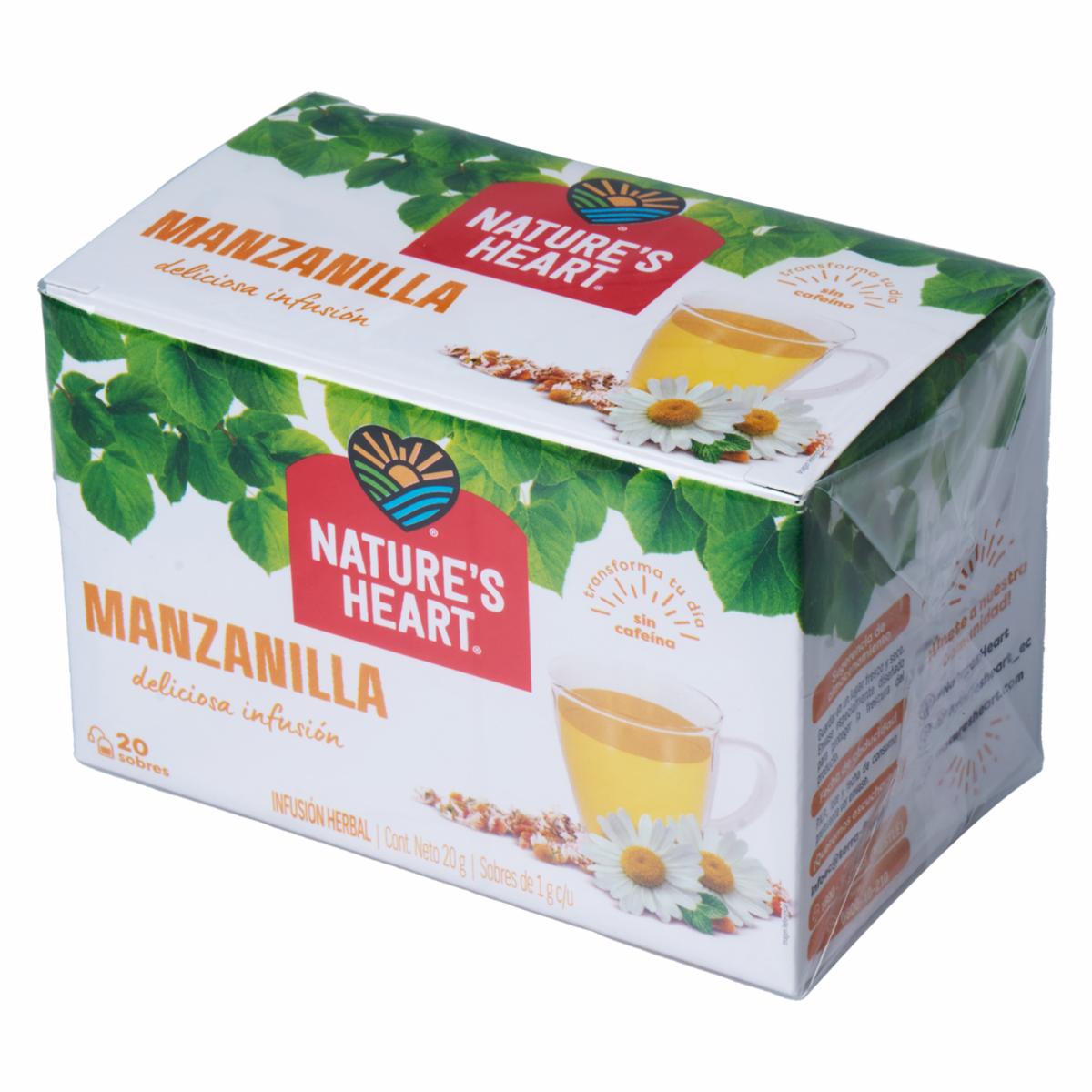 - La Infusión de Manzanilla NATURE'S HEART es ideal para relajarte naturalmente en cualquier momento del día. Su sabor suave y aroma floral ayudan a calmar el cuerpo y la mente. Elaborada con manzanilla 100% natural y sin cafeína. Contiene 20 sobres individuales de 1 g cada uno