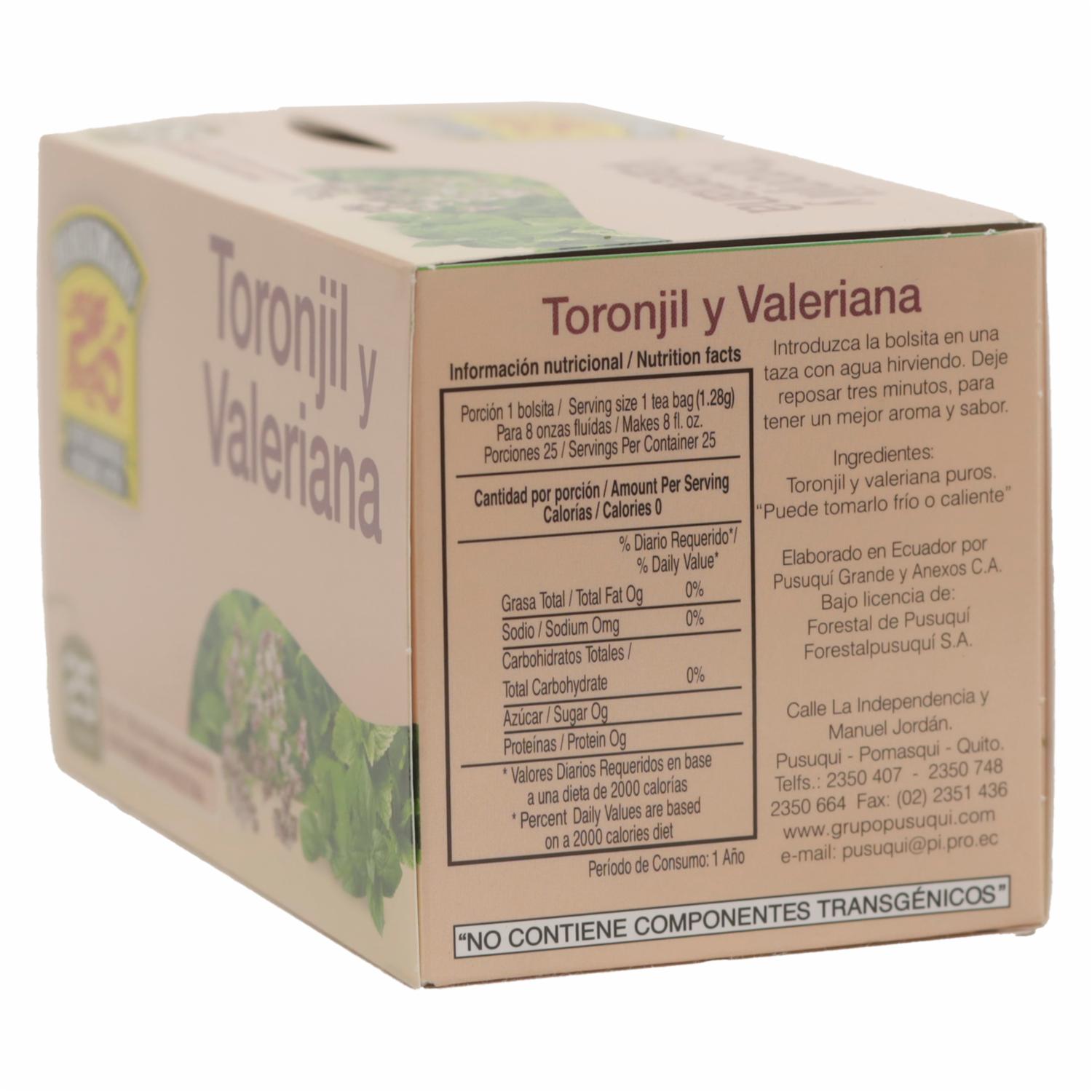 - La infusión de Toronjil y Valeriana ofrece beneficios para la relajación, el sueño y el estrés, el toronjil es conocido por sus efectos calmantes y sedantes mientras que la valeriana ayuda a reducir la ansiedad y mejora la calidad del sueño