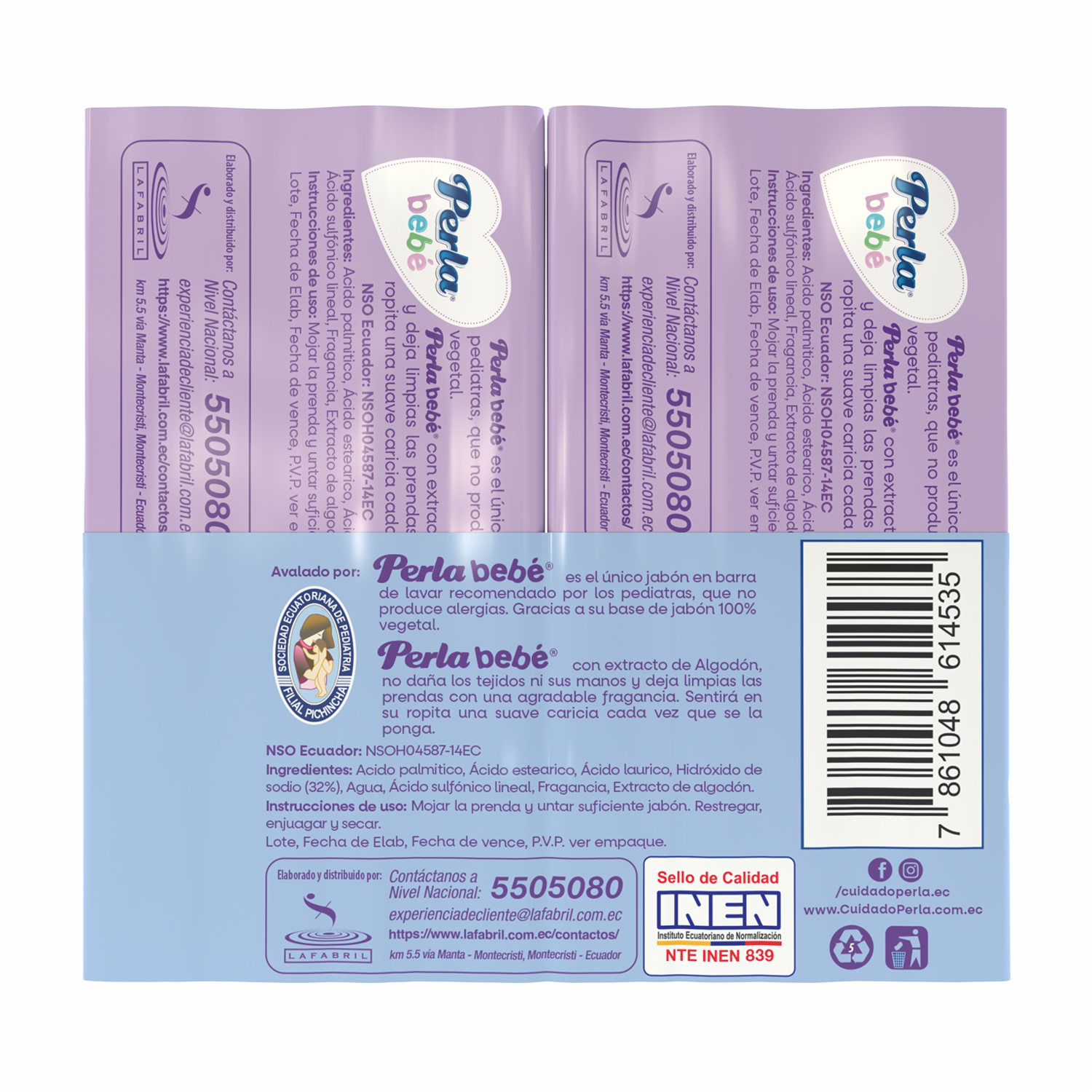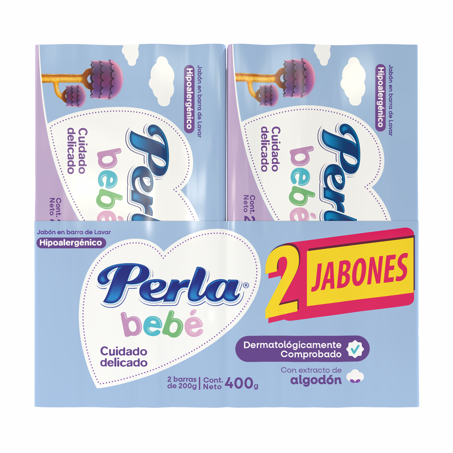 - El jabón de lavar ropa Perla Bebé con extracto de algodón está diseñado especialmente para el cuidado de la delicada piel de tu bebé. Su fórmula 100% vegetal, hipoalergénica y dermatológicamente comprobada limpia eficientemente sin irritar. Además, es el único avalado por la Sociedad Ecuatoriana de Pediatría, garantizando seguridad y suavidad en cada lavado