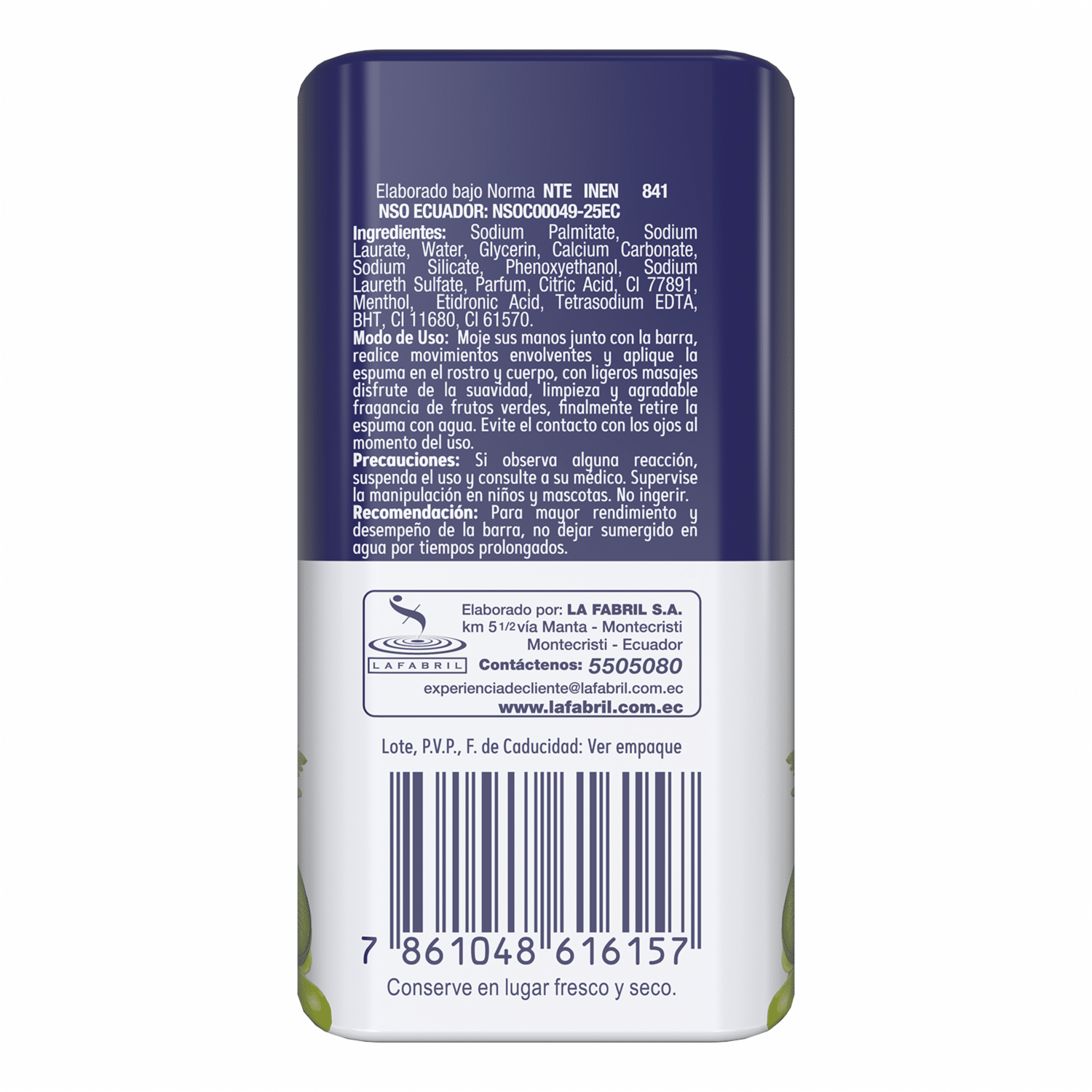 Siente la frescura natural con el jabón de tocador Frescura Natural de frutos verdes. Su fórmula con óleos humectantes limpia profundamente y elimina el 99.9% de las bacterias, dejando la piel suave, fresca y revitalizada. Perfecto para una limpieza diaria que despierta tus sentidos