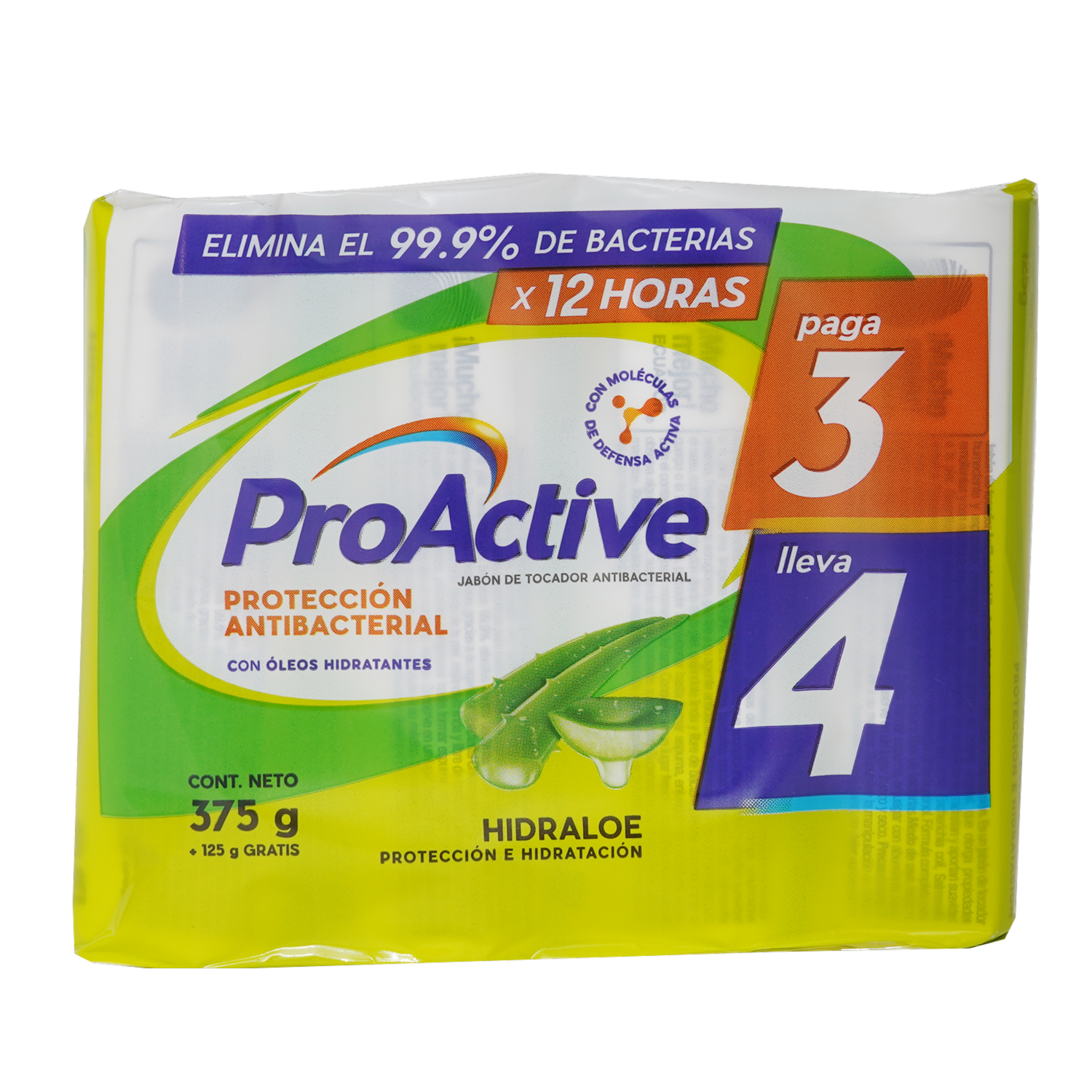 - Jabón En Barra Proactive Antibacterial Elimina El 99.9% De Las Bacterias Y Brinda Protección Hasta Por 12 Horas. Fragancia Hidraloe, Contiene 375 Gramos