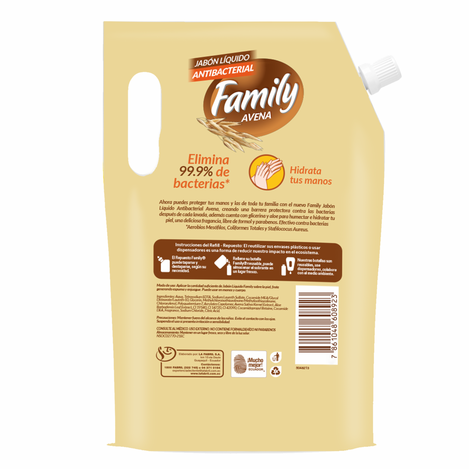 El Nuevo Jabón Liquido Family Antibacterial Fragancia Avena, Elimina El 99,9% Bacterias E Hidrata Tus Manos En Formato Doy Pack 1900ml