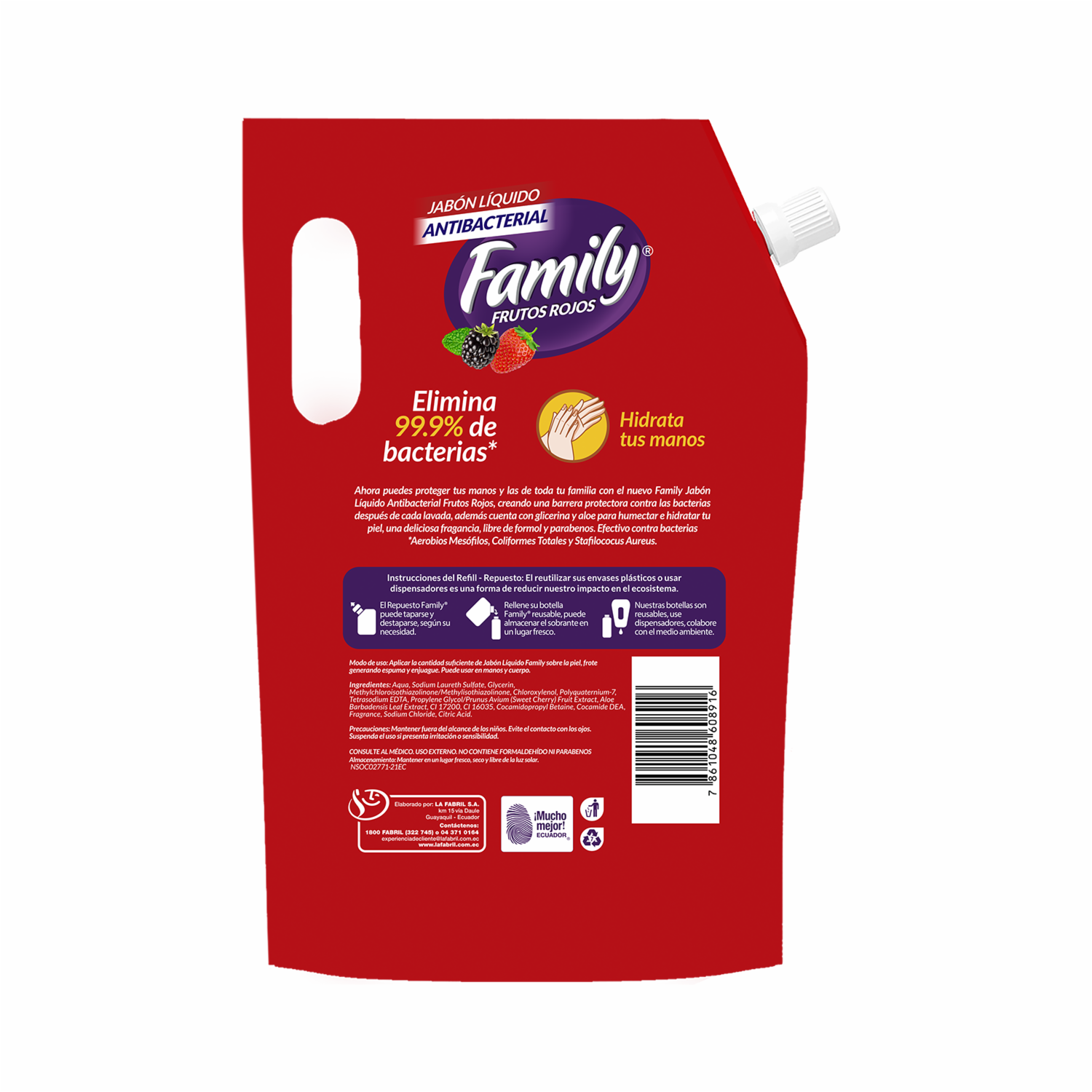 - El Nuevo Jabón Liquido Family Antibacterial Fragancia Frutos Rojos, Elimina El 99,9% Bacterias E Hidrata Tus Manos En Formato Doy Pack 1900ml