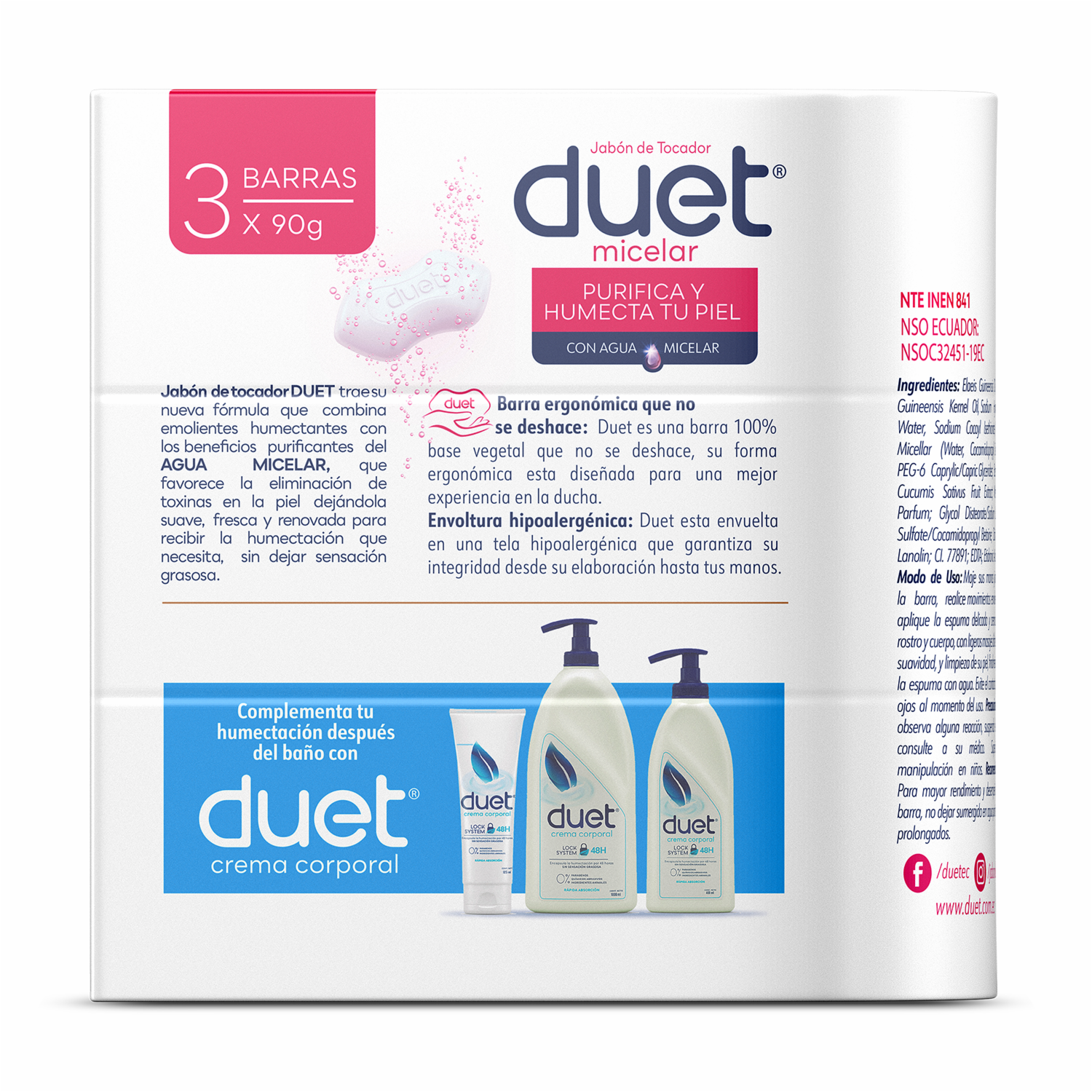 - Jabón De Tocador Duet Micelar 270 Gramos Es El Jabón De Tocador Corporal Con Agua Micelar Que Purifica Y Humecta Tu Piel Sin Dejar Sensación Grasosa