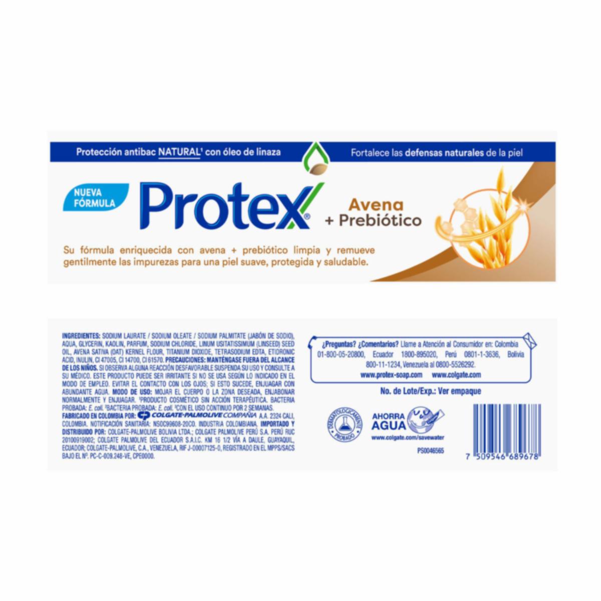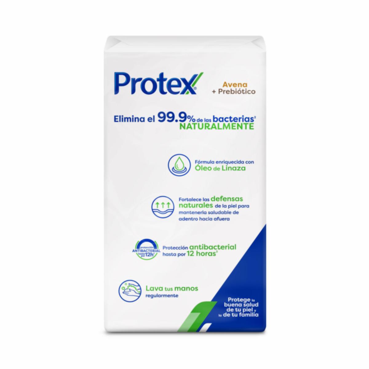 - El Jabón de Avena + Prebiótico Protex proporciona una protección antibacteriana natural, elimina las impurezas y mantiene la protección diaria de tu piel. Además de todas las propiedades del jabón de avena, contiene prebióticos en su formulación, que elimina y limpia suavemente y elimina las impurezas de tu piel. Elimina el 99.9 % de las bacterias naturalmente manteniéndote protegido al largo del día
