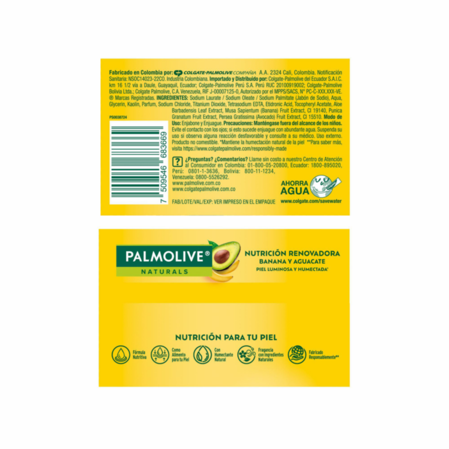 - Disfruta de una deliciosa fragancia y una piel humectada, realizando tu limpieza personal con el Jabón Corporal Palmolive Naturals® Banana y Aguacate. Este jabón Palmolive tiene una fórmula humectante, que le dará suavidad a tu piel y una sensación cremosa diariamente, para una piel suave y hermosa