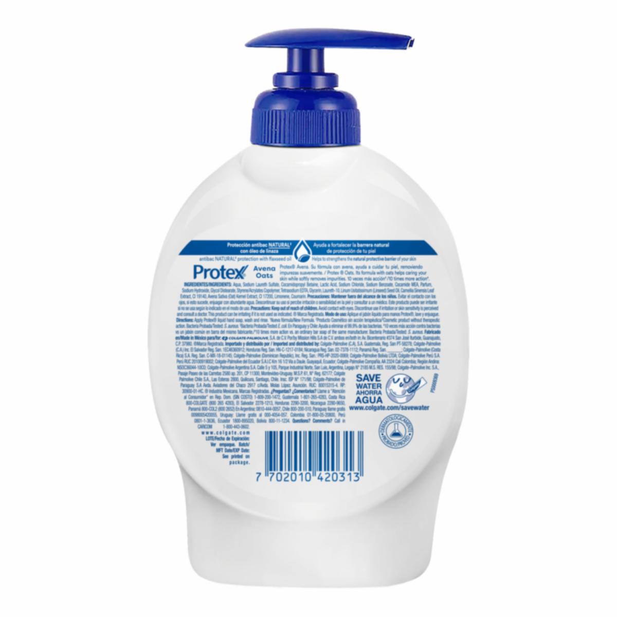 - Mantén una higiene óptima con el Jabón Líquido Antibacterial para Manos Protex Avena 221 ml, su presentación es ideal para ti y tu familia