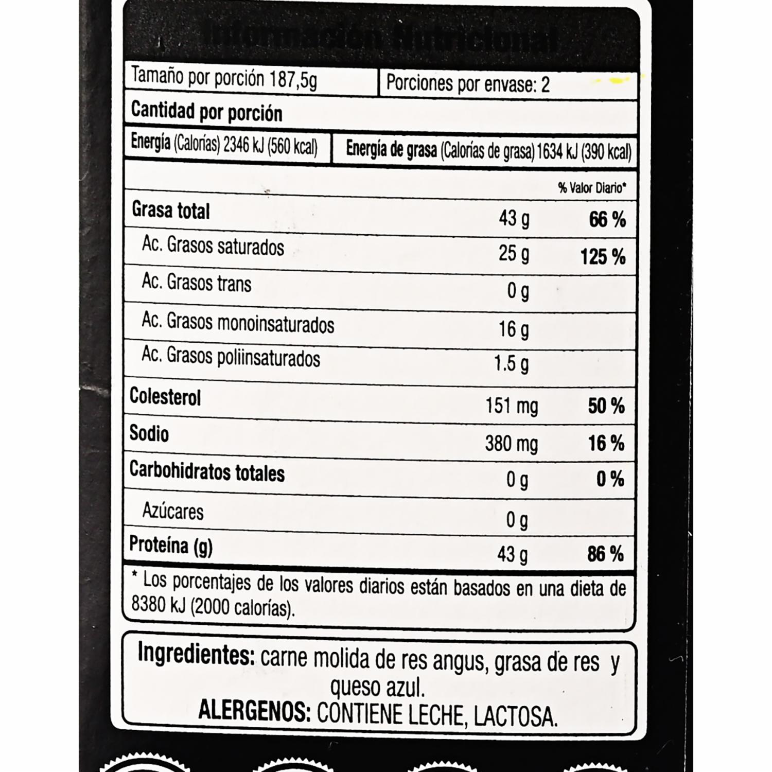 • Está elaborado con carne de res de primera calidad y cuenta con un intenso sabor a queso azul