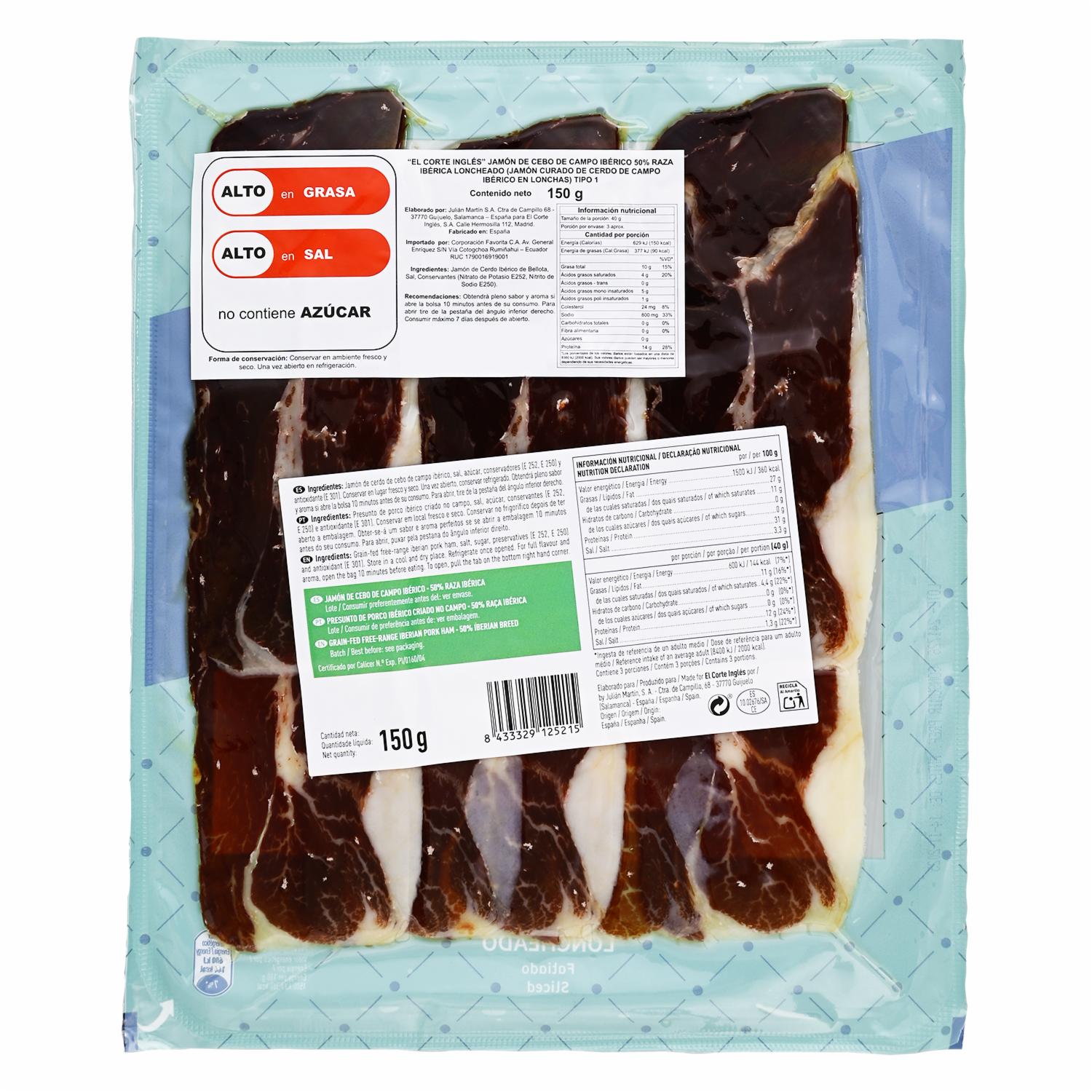Jamón De Cebo De Campo 0.5 Raza Ibérico Lonchado EL CORTE INGLÉS 150 G