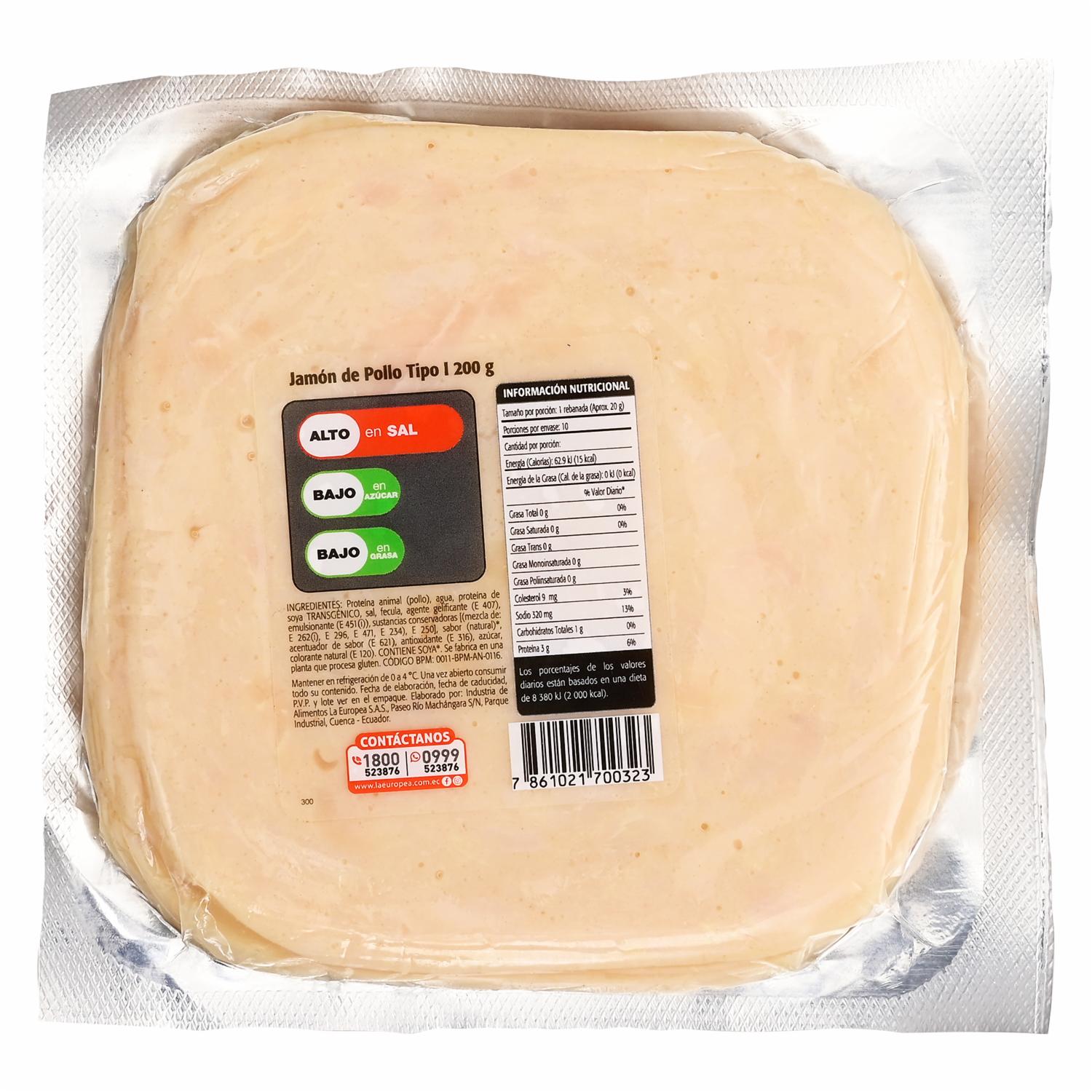 - Jamón de pollo tipo 1, libre de transgénicos y gluten