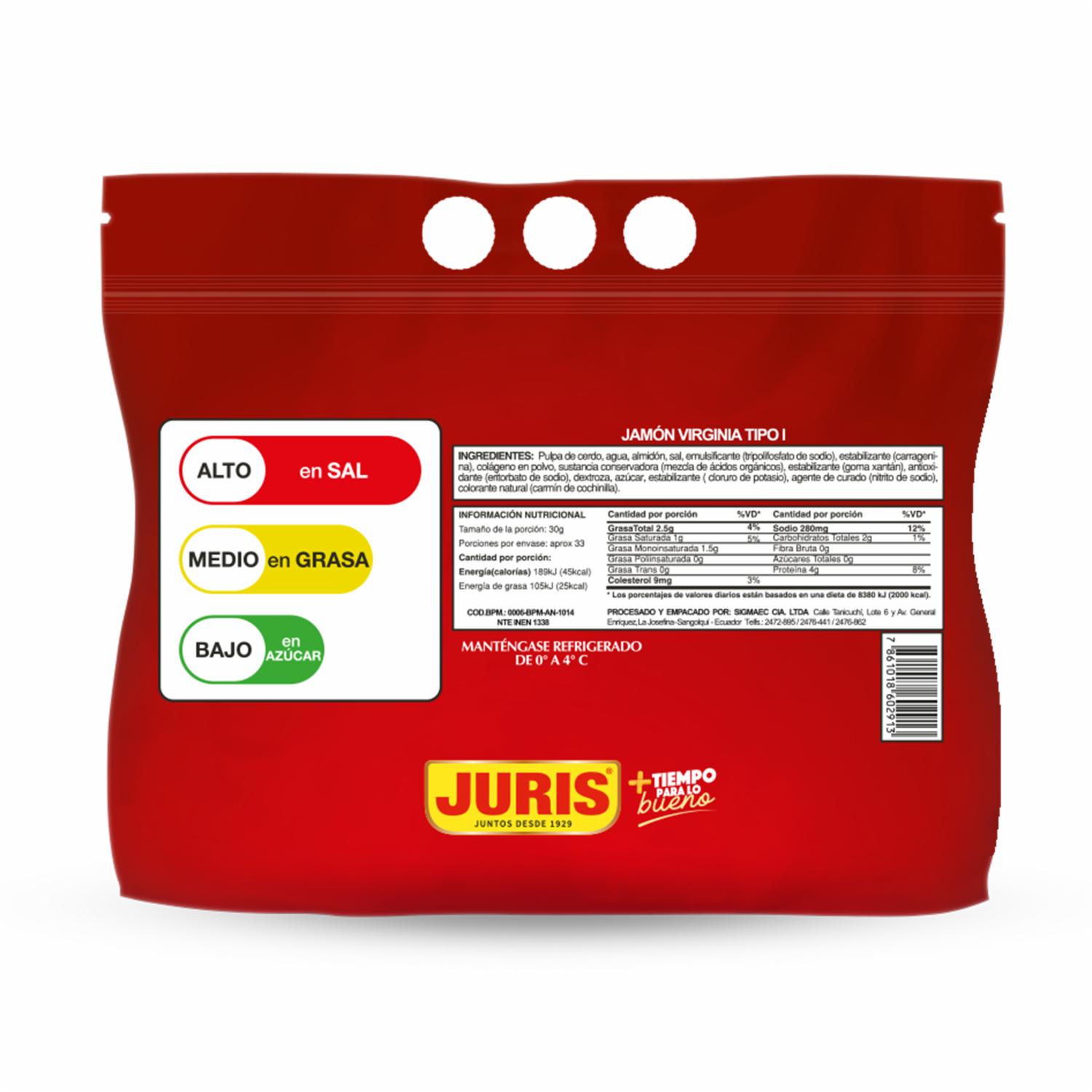 Jamón Virginia Navideño JURIS 1000 G – JURIS. Disponible en nuestros locales. Precio y stock pueden variar según la tienda.
