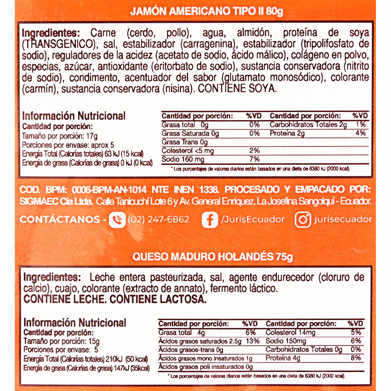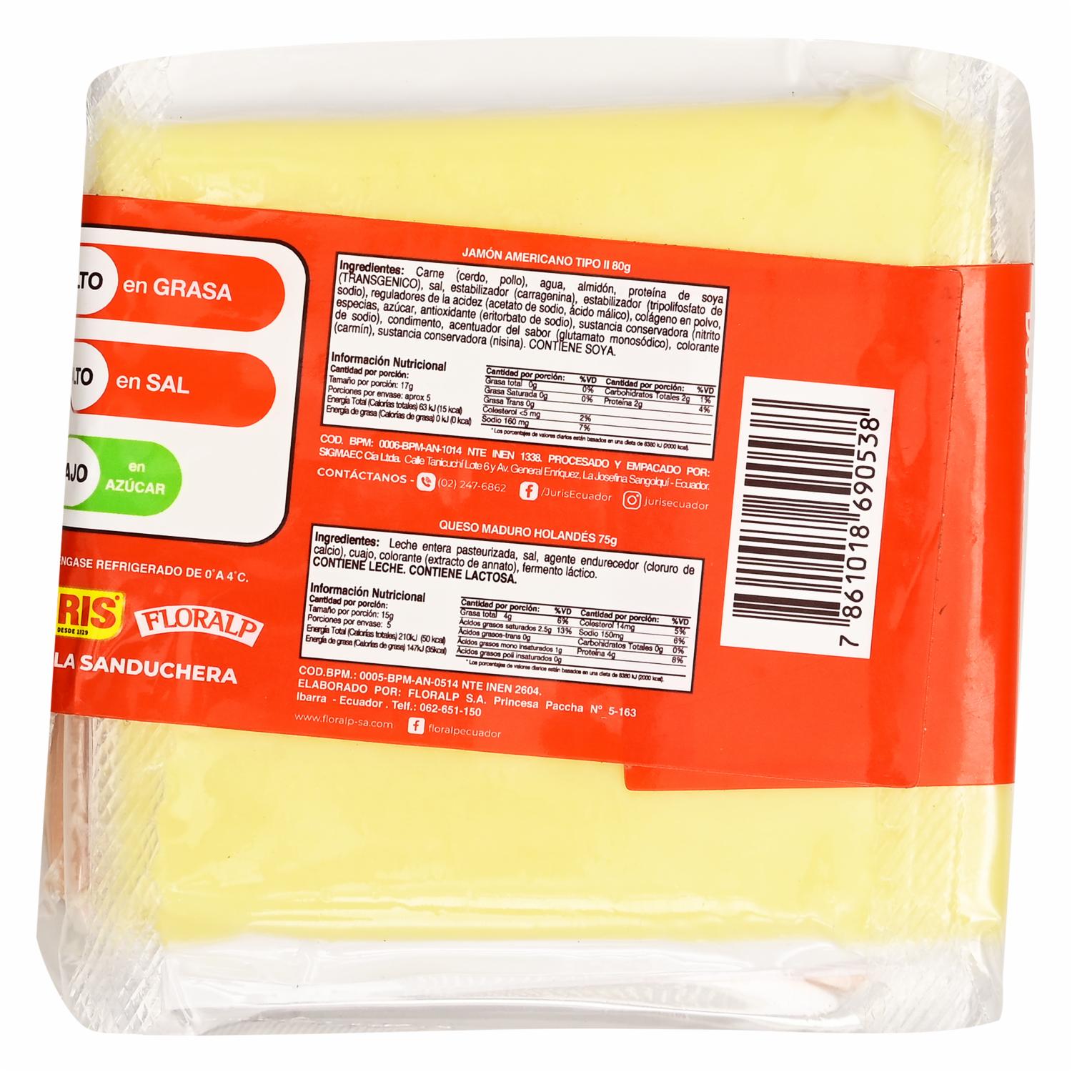 Jamón Y Queso Americano Holandés Dupla Sanduchera JURIS 155 G