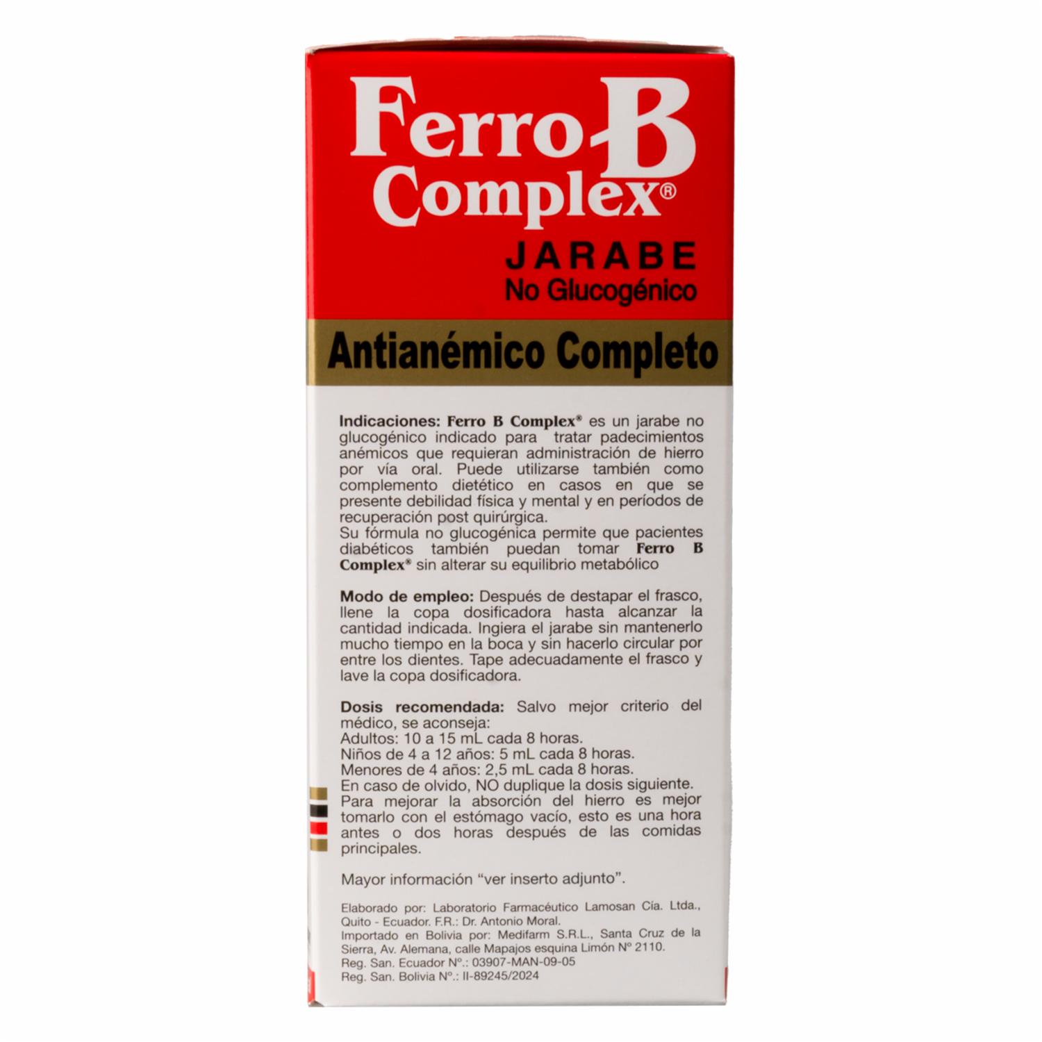 - Ferro B Complex Jarabe es un antianémico completo con hierro de fácil absorción y vitaminas del complejo B. Ideal para el uso en niños y adultos