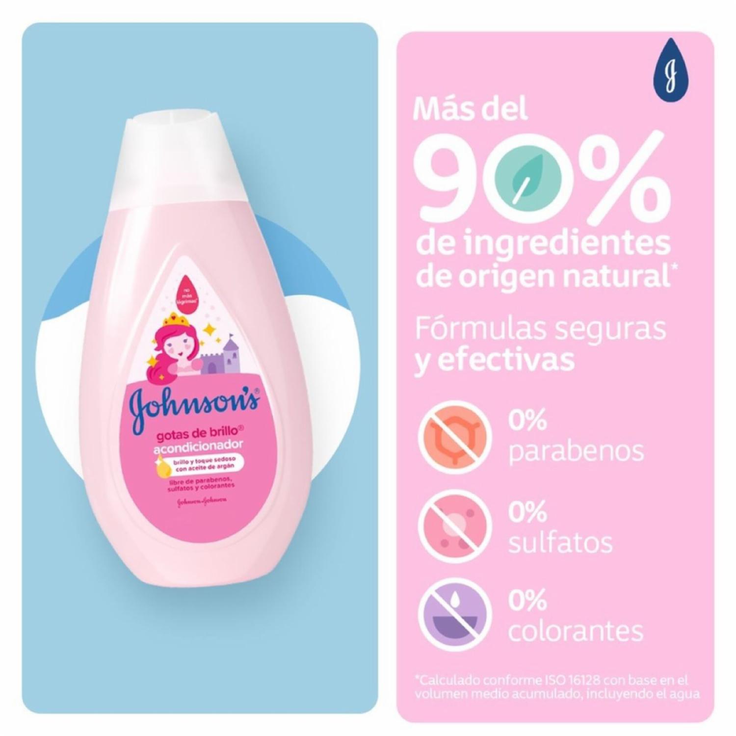 Acondicionador JOHNSON'S® Gotas de Brillo realza el brillo natural del pelo, dejándolo suave y con un toque aterciopelado, ya que cuenta con aceite de argán y proteínas de seda en su formulación