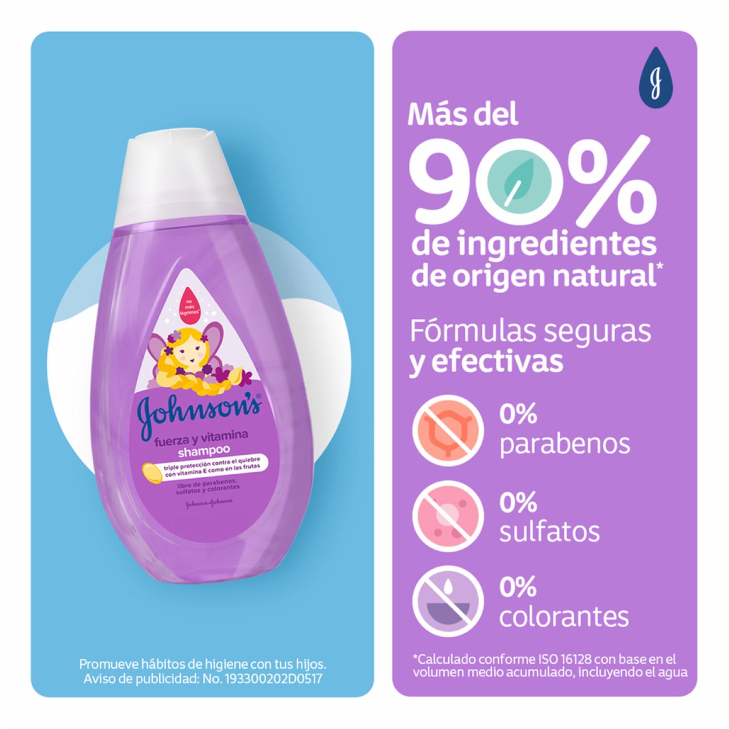 - Shampoo JOHNSON'S Fuerza Vitamina realza la fuerza natural propia del pelo en desarrollo, con triple protección contra el quiebre