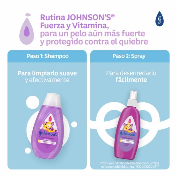 Shampoo JOHNSON'S Fuerza Vitamina realza la fuerza natural propia del pelo en desarrollo, con triple protección contra el quiebre