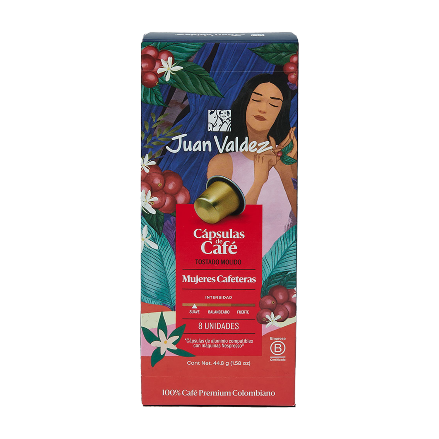 - Prueba las cápsulas de café tostado y molido Juan Valdez intensidad suave, cultivado y cosechado por mujeres cafeteras