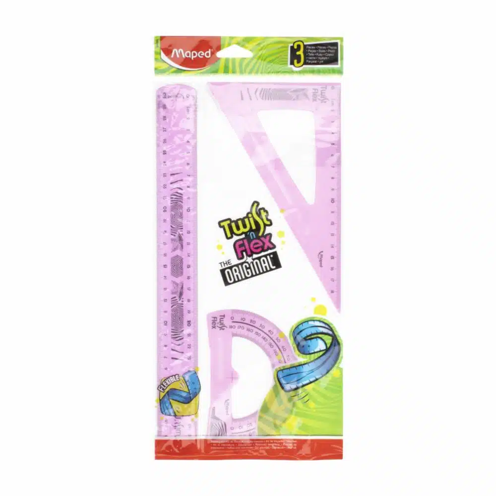 Juego de reglas flexibles Maped twistn flex. Incluye: 1 pieza regla 30 cm, 1 pieza cuadrado 60°/15 cm, 1 pieza transportador 180°/10 cm, Fabricada en material flexible resistente a la rotura