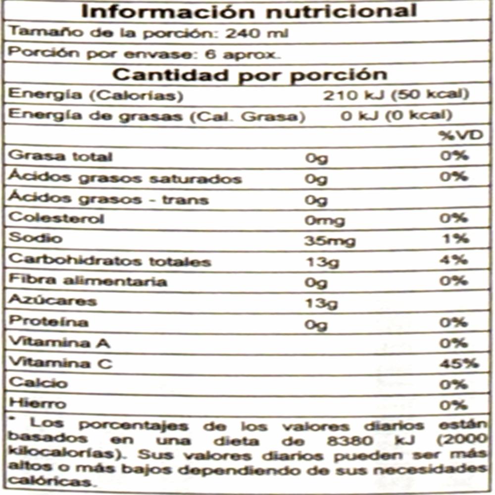Es 100% jugo de fruta sin azúcar añadido. Dos porciones (una taza) de fruta y 100% de tu vitamina C diaria en cada vaso. Sin conservantes, sabores artificiales o edulcorantes. Jugos de uva y concord (agua, concentrados de jugo de uva y concordía), jugo de arándano (agua, concentrado de jugo de arándano), jugo de manzana (agua, concentrado de jugo de manzana), sabores naturales, ácido ascórbico (vitamina C), ácido fumárico