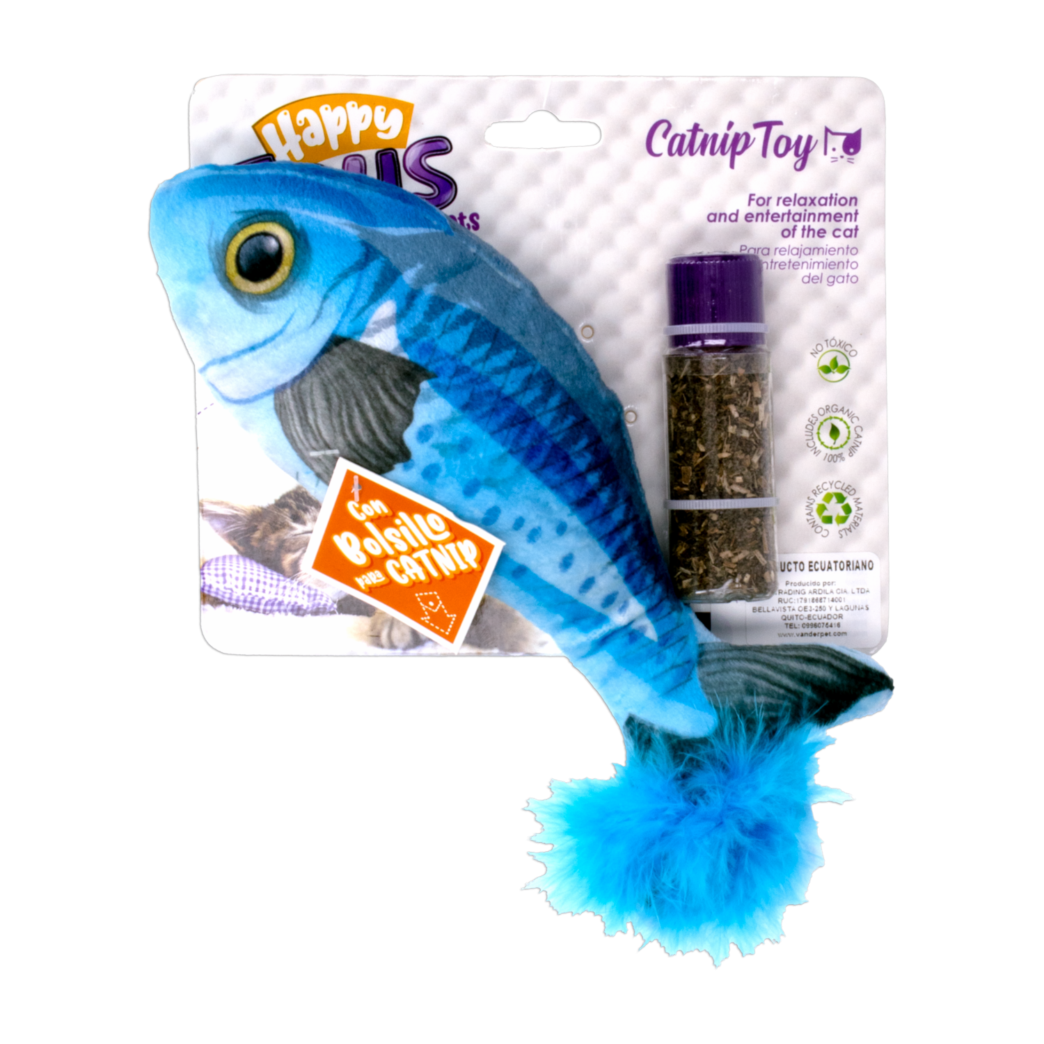 - El juguete para gato con forma de pez que contiene catnip (hierba gatera) de Happy es un artículo diseñado para entretener y estimular a los gatos