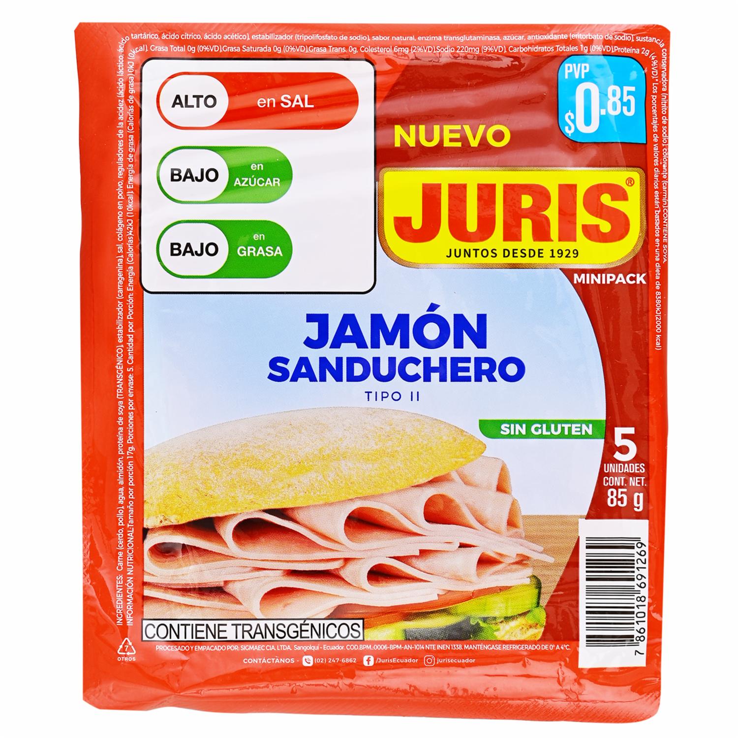 Jamón Sanduchero Tipo 2 Sin Gluten JURIS 85 G – JURIS. Disponible en nuestros locales. Precio y stock pueden variar según la tienda.