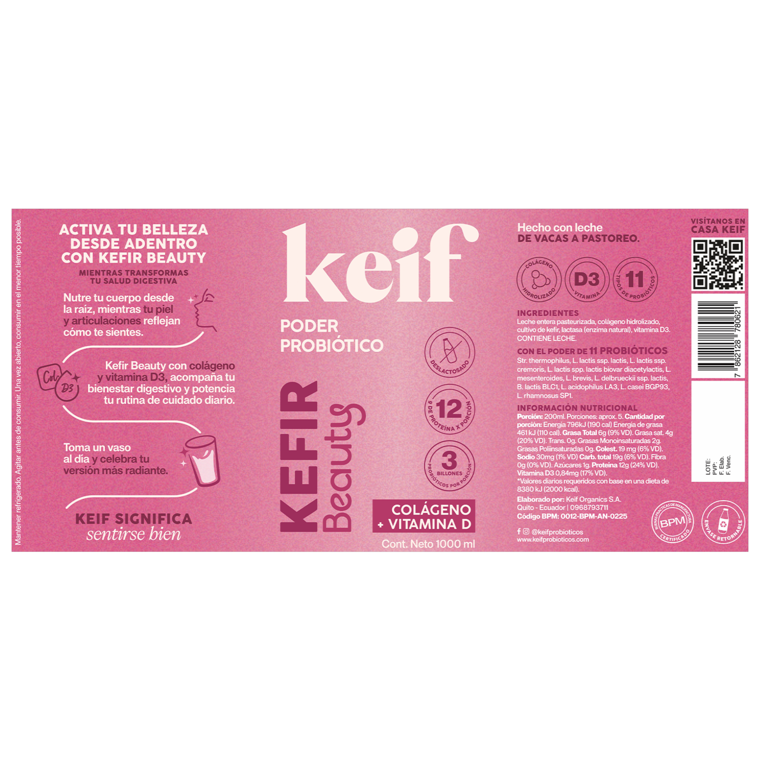 Es una bebida probiótica elaborada con cultivos vivos que ayudan al cuidado intestinal. Contiene colágeno hidrolizado que apoya la firmeza de la piel y vitamina D3 que contribuye al bienestar óseo. Ideal para consumir a diario como parte de una rutina de salud. Su sabor suave permite disfrutarlo solo o mezclado con frutas. Recomendado para consumo diario