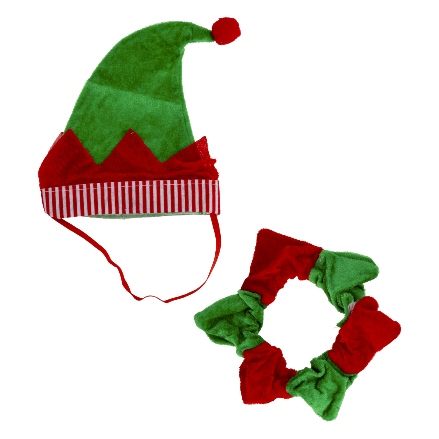 - Set festivo para mascota con gorro y corbatín con diseño de duende, ideal para celebrar la Navidad con estilo.