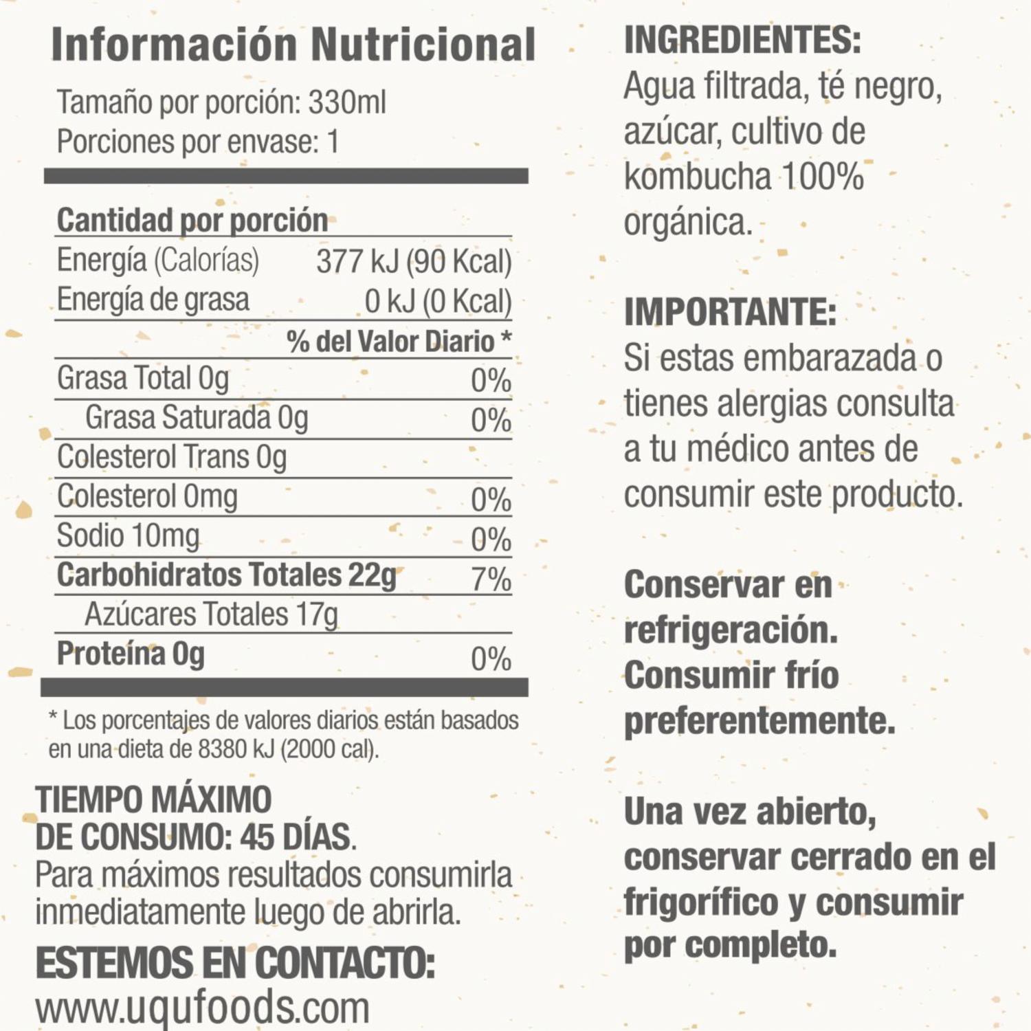Refresca tu cuerpo de forma natural con la Kombucha Andina de té negro UQU. Esta bebida probiótica 100% natural combina el sabor intenso del té con beneficios digestivos, desintoxicantes y antioxidantes. Ideal para cuidar tu bienestar mientras disfrutas de una hidratación saludable