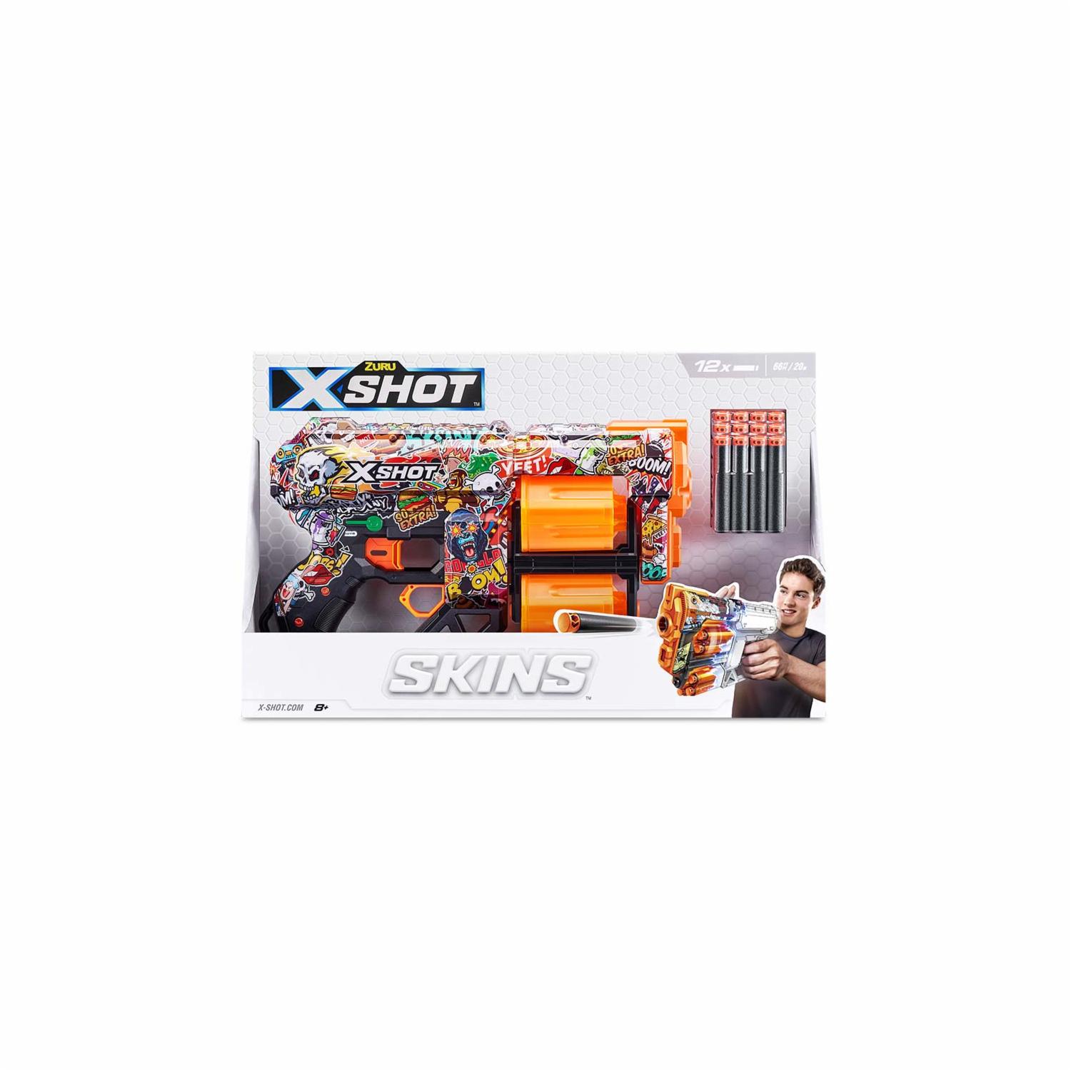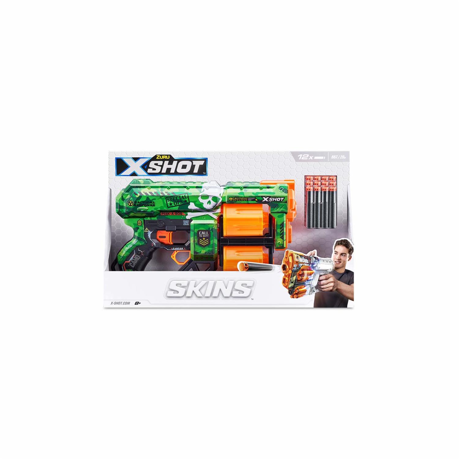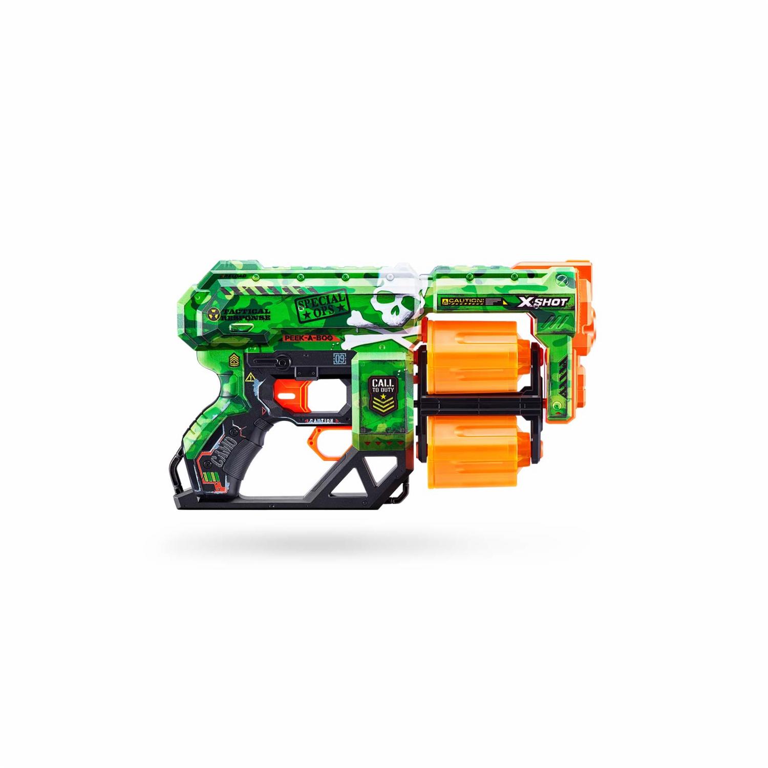 - Usando tecnología de impresión de última generación, X-Shot Skins Dread, con 12 Dardos es un blaster diseñado a medida que trae la experiencia del juego de desollar tu blaster al campo de batalla. La diversión nunca se detiene con una capacidad de 12 dardos con dos cilindros giratorios. Cuando te quedes sin dardos en un barril, ¡simplemente cambia al segundo para acabar con la competencia!