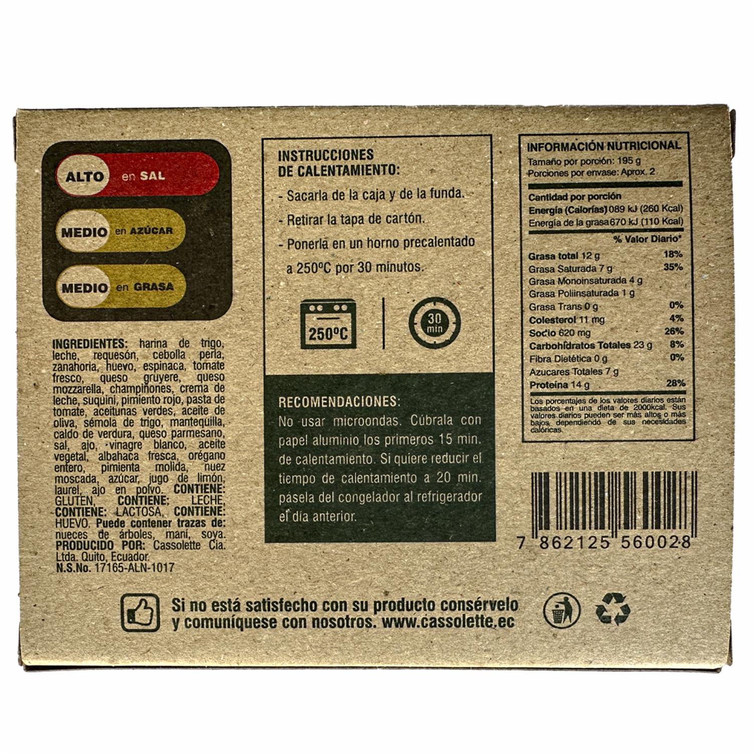 - Lasagna de vegetales Cassolette es un plato vegetariano. - Contiene una mezcla de verduras como zanahorias, calabacines, cebollas, espinacas y champiñones. - Está hecho con pasta de lasagna y salsa de tomate casera. - Es una opción saludable y baja en grasas saturadas. - Se puede servir como plato principal o como acompañamiento