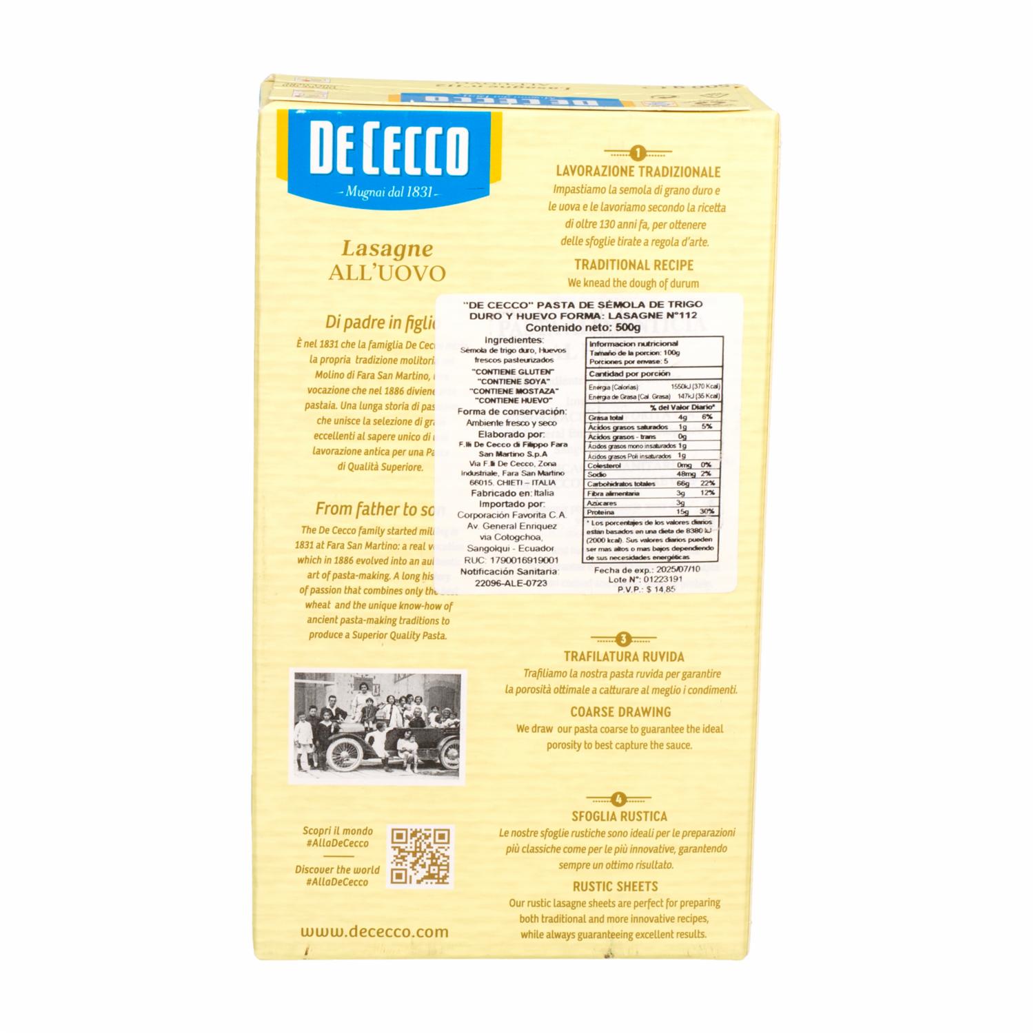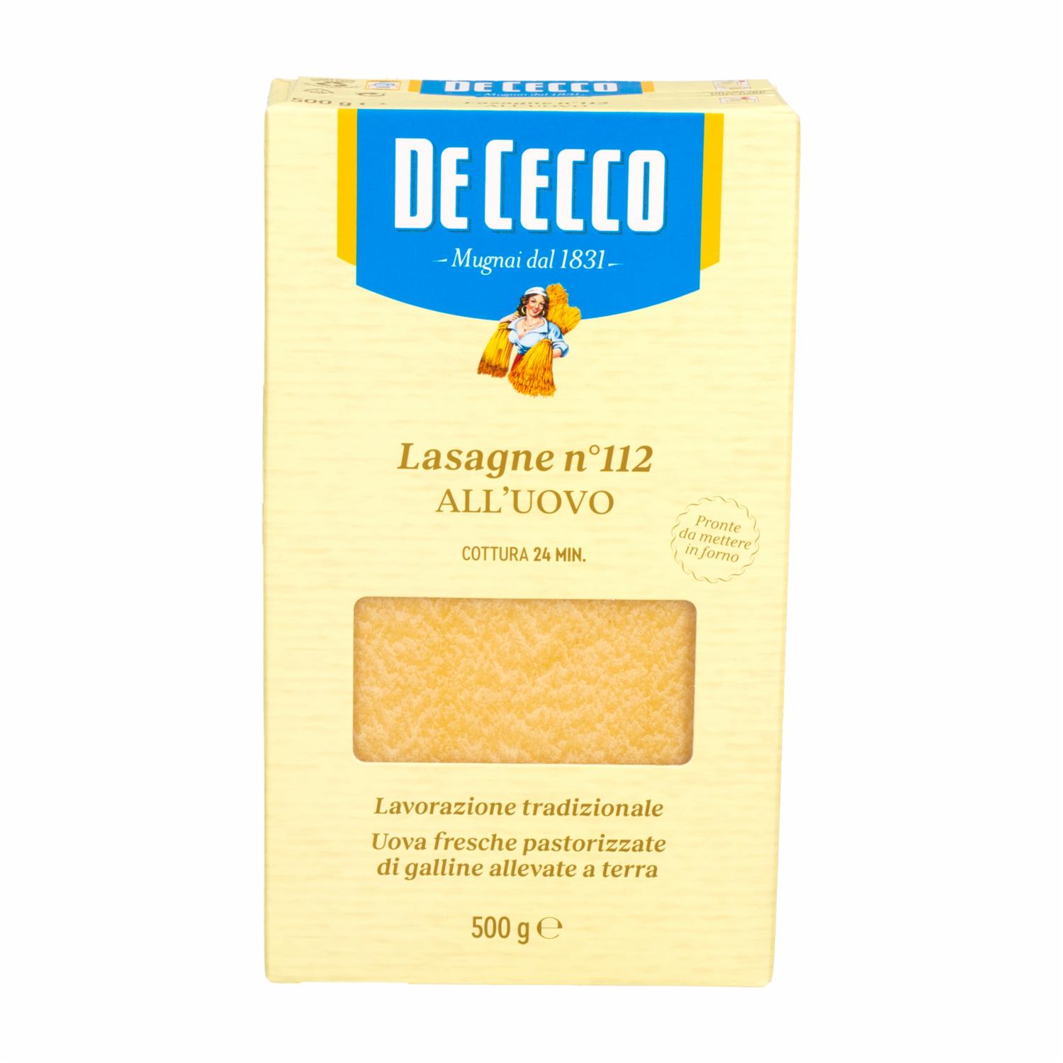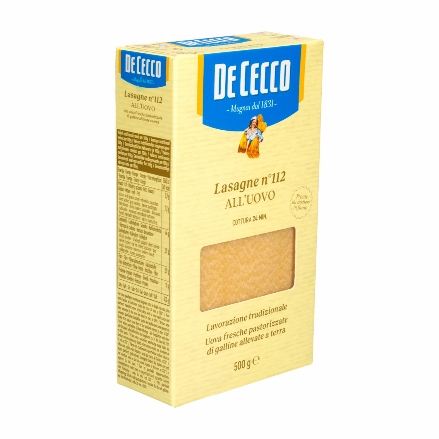 - Experimenta el sabor auténtico de la pasta italiana con la Lasaña al Huevo DE CECCO. En su presentación de 500 g, esta lasaña al huevo es perfecta para preparar platos clásicos y reconfortantes, ofreciendo una textura y sabor excepcionales que elevarán tus recetas de lasaña a un nuevo nivel