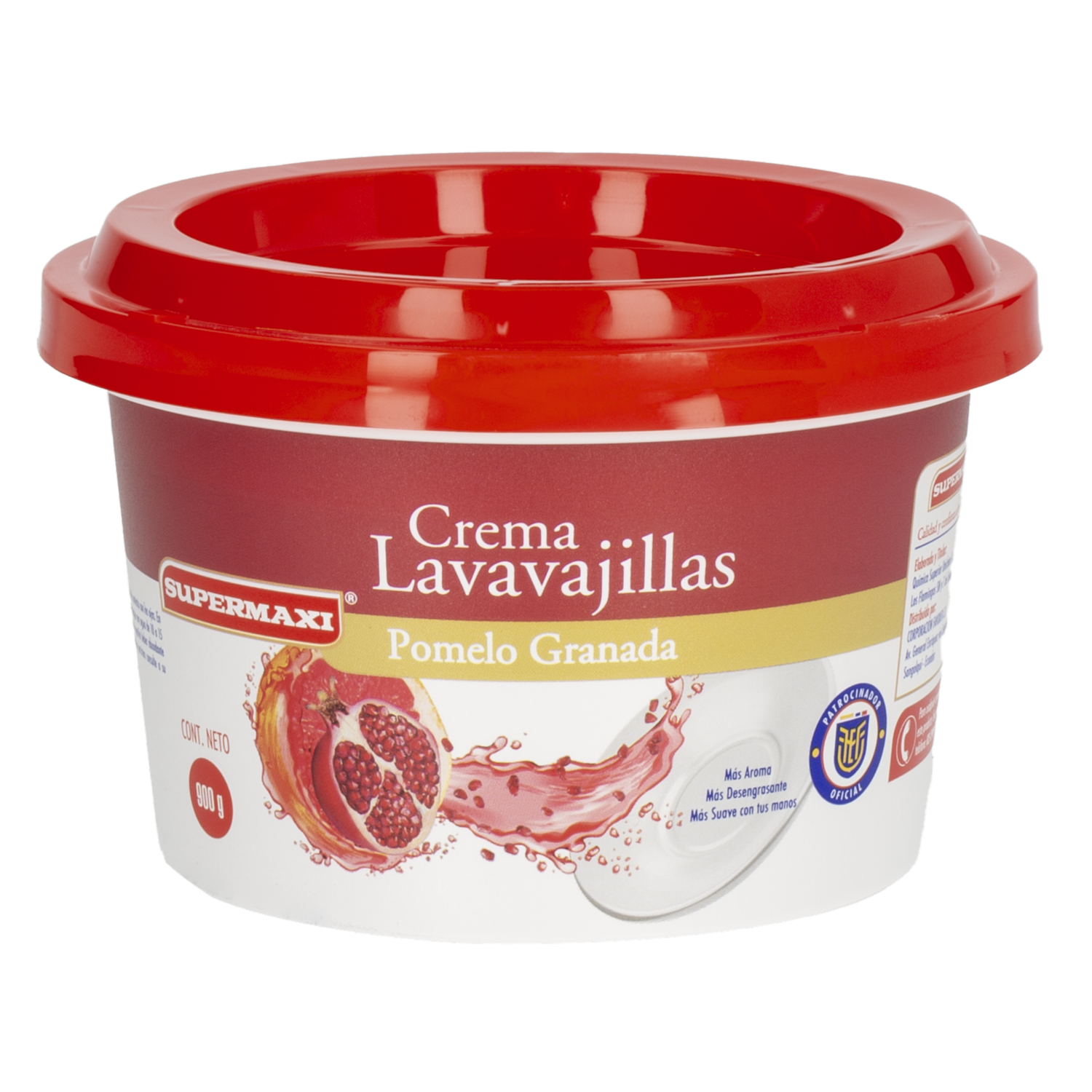- Crema lavavajillas Supermaxi aroma Pomelo Granada, ideal para eliminar grasa y restos de alimentos en platos, ollas y utensilios de cocina. Su fórmula concentrada ofrece una limpieza eficaz mientras es más suave con las manos durante el uso