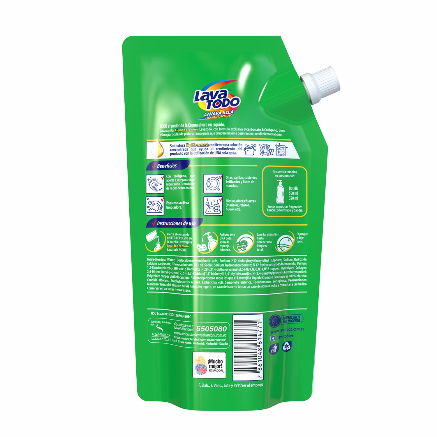 - Limpia y protege tu vajilla con este lavavajillas líquido enriquecido con bicarbonato y colágeno. Su fórmula potente elimina grasa y deja un aroma fresco a limón concentrado, cuidando tus manos y utensilios